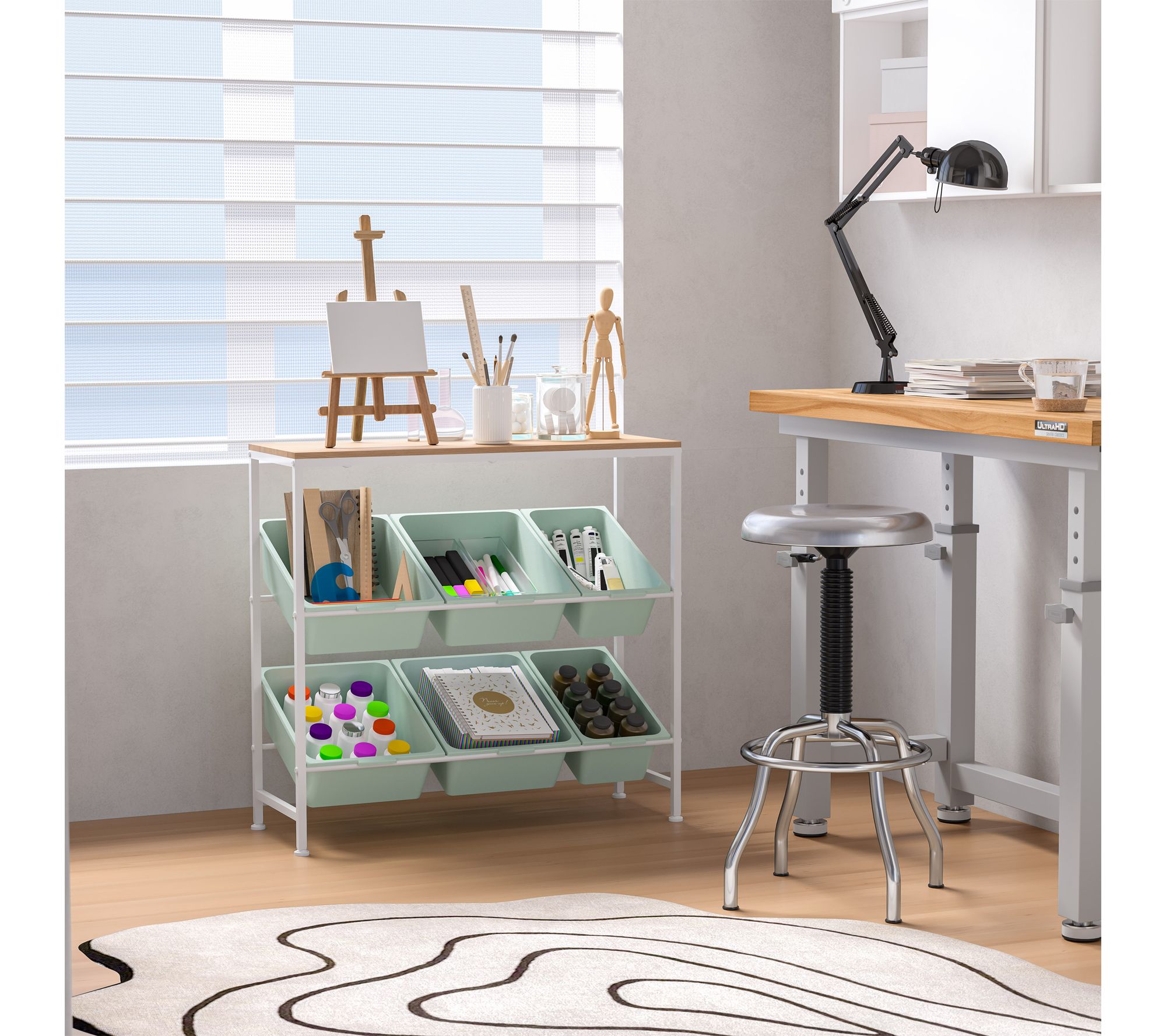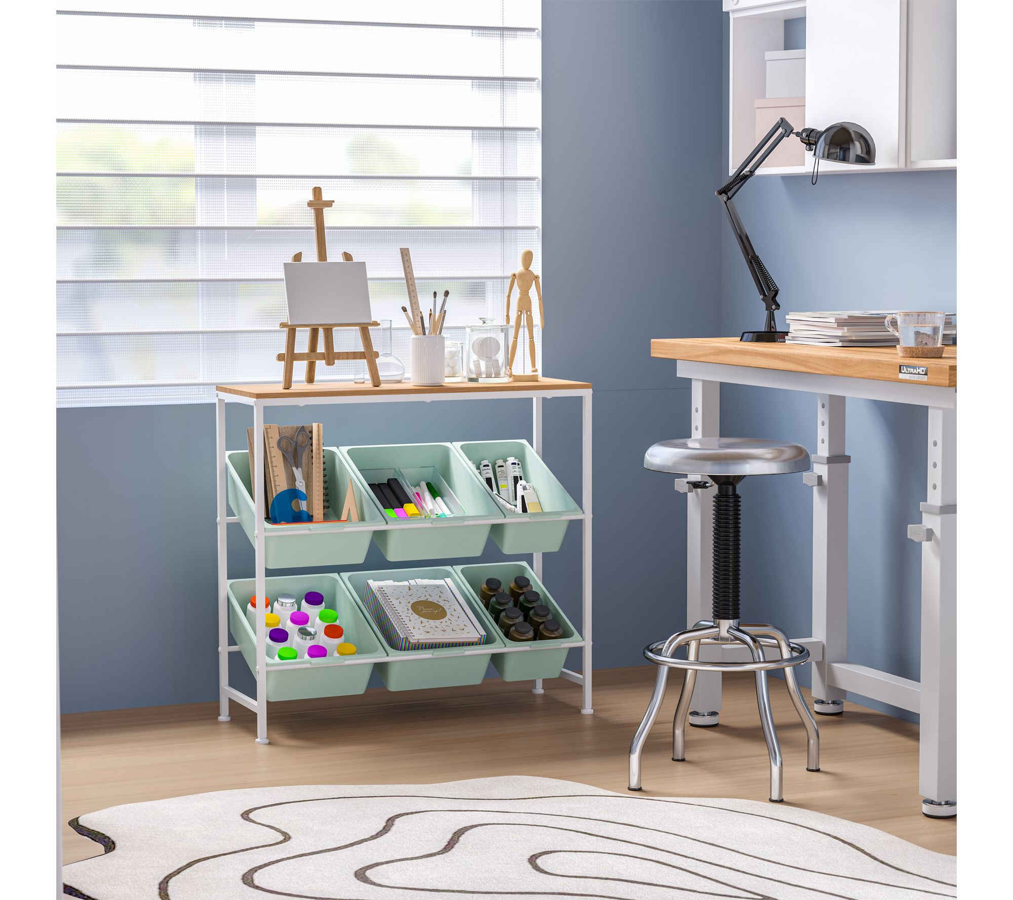 Tidy up any room in style with this multi-use storage organizer cart -- perfect for keeping crafts, office supplies, or toys neatly stashed away in any busy household. With six colorful removable bins and a sturdy steel frame topped with a spacious shelf, it's a practical solution for bedrooms, playrooms, or even the kitchen. From Seville Classics.