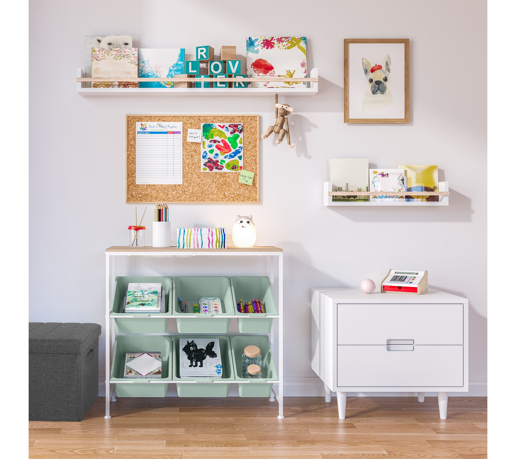 • Features four large removable bins, two medium removable bins, solid MDF top shelf, steel frame in matte white finish, and four adjustable leveling feet