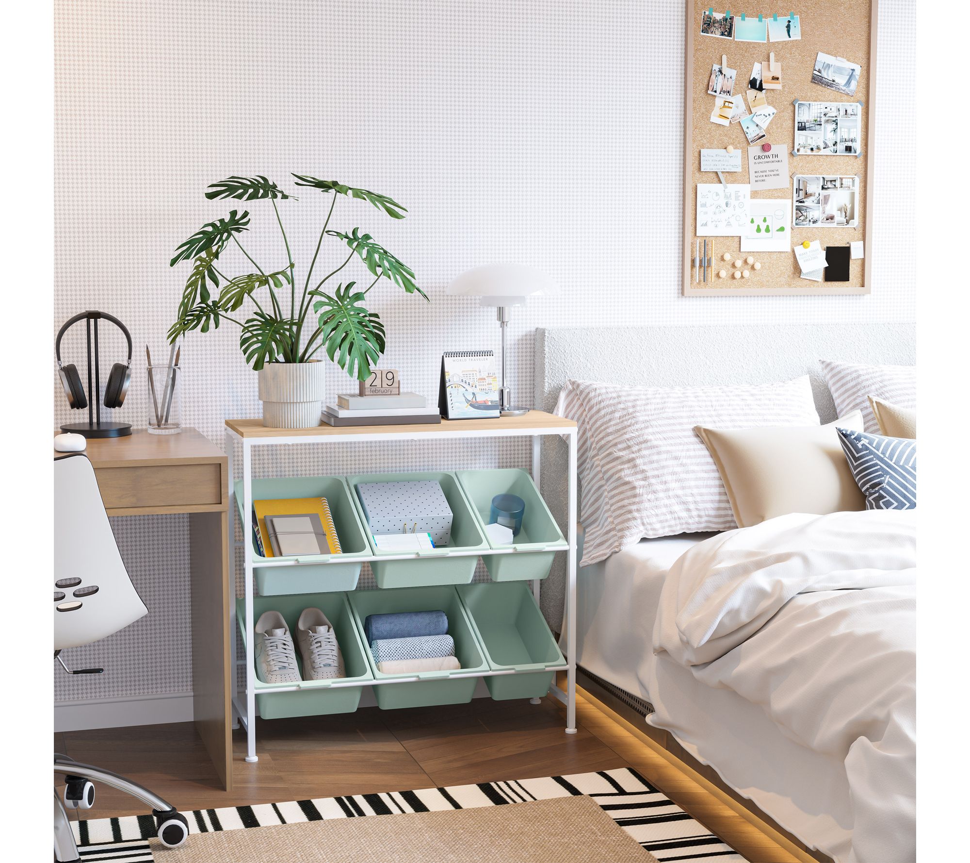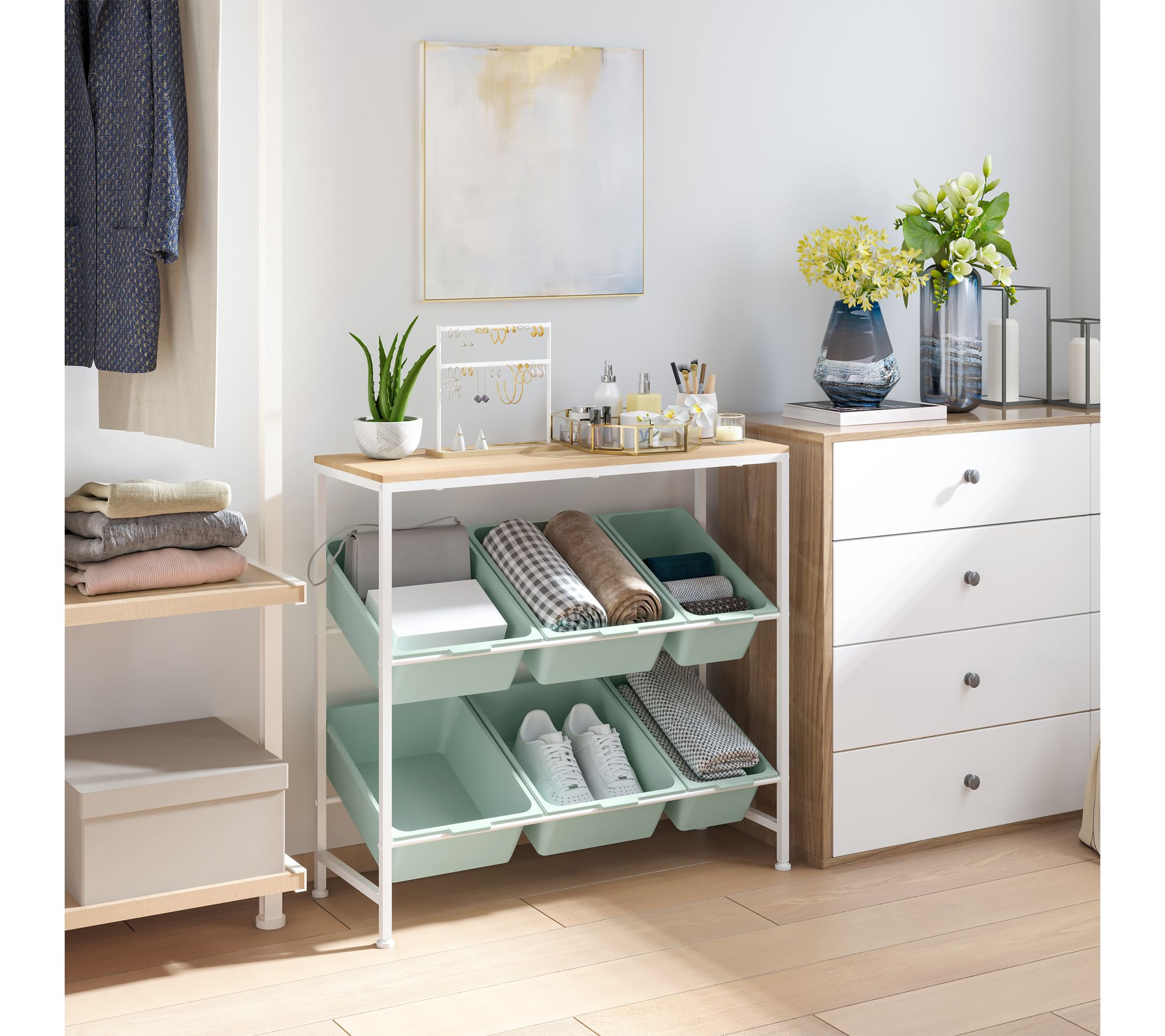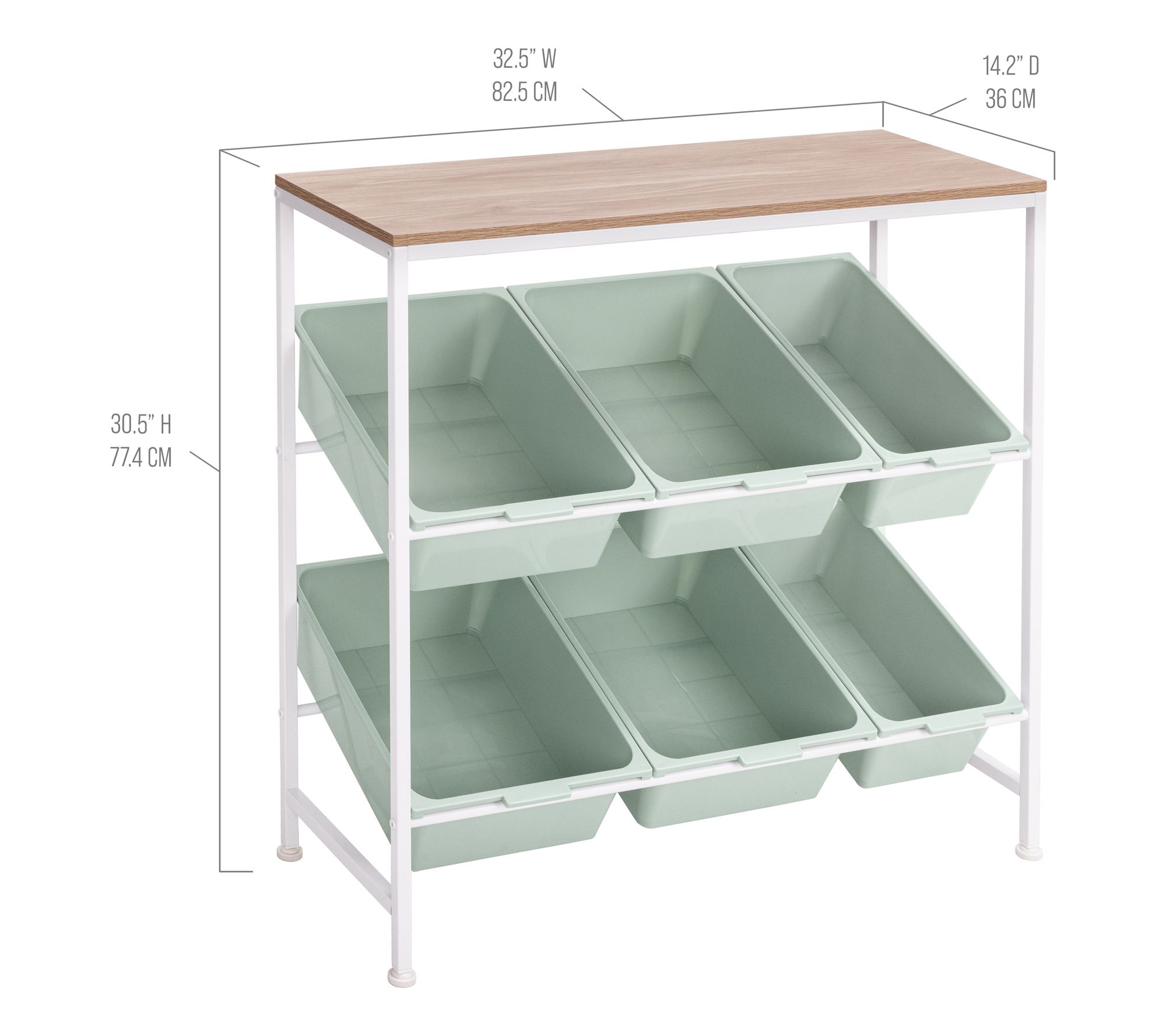 • Measures approximately 32.5"W x 14.2"D x 30.5"H; supports up to 100 lbs (66 lbs top shelf, 6.5 lbs per large bin, 4 lbs per medium bin)