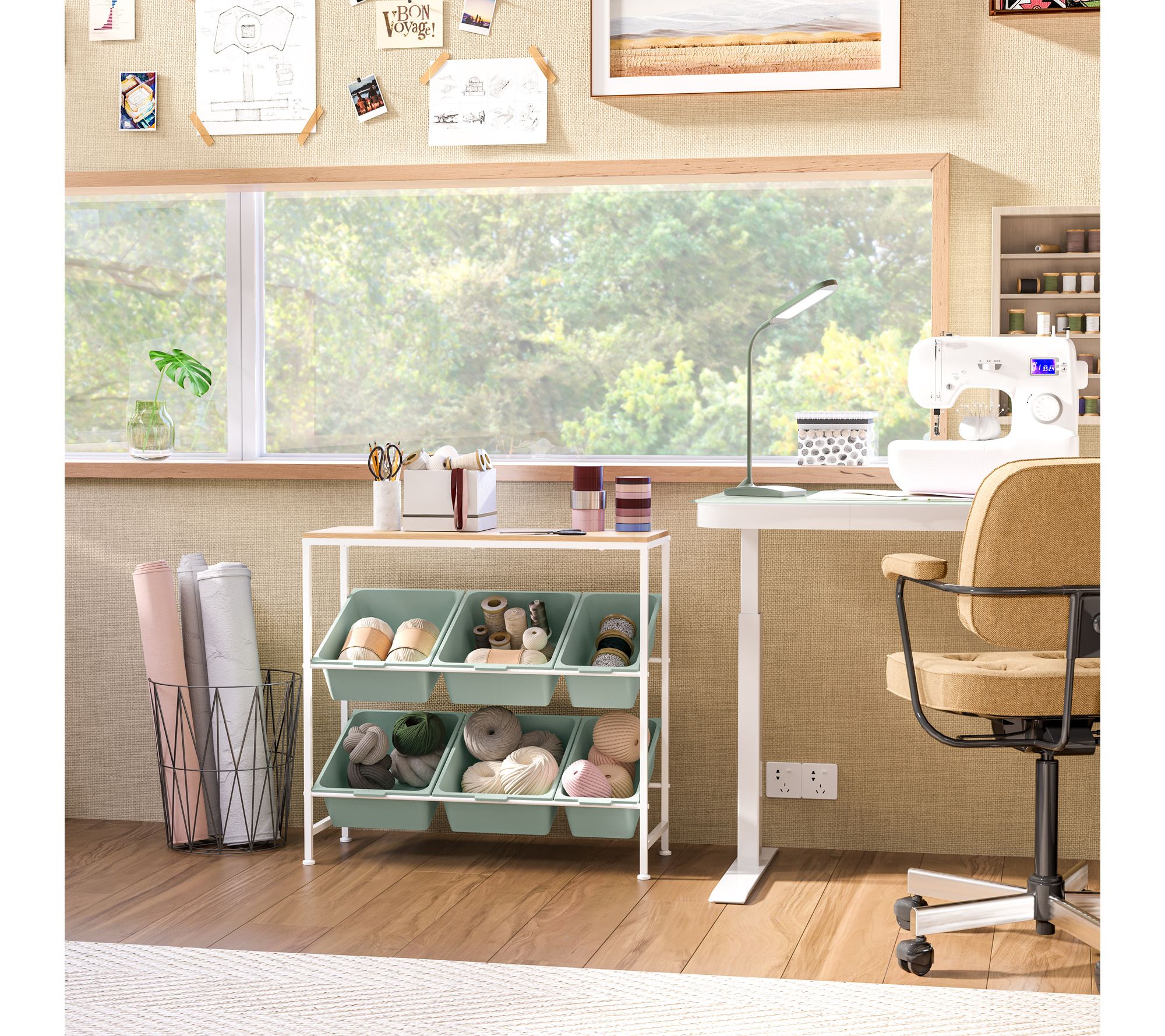 • Polypropylene bins; laminated MDF shelf; steel frame