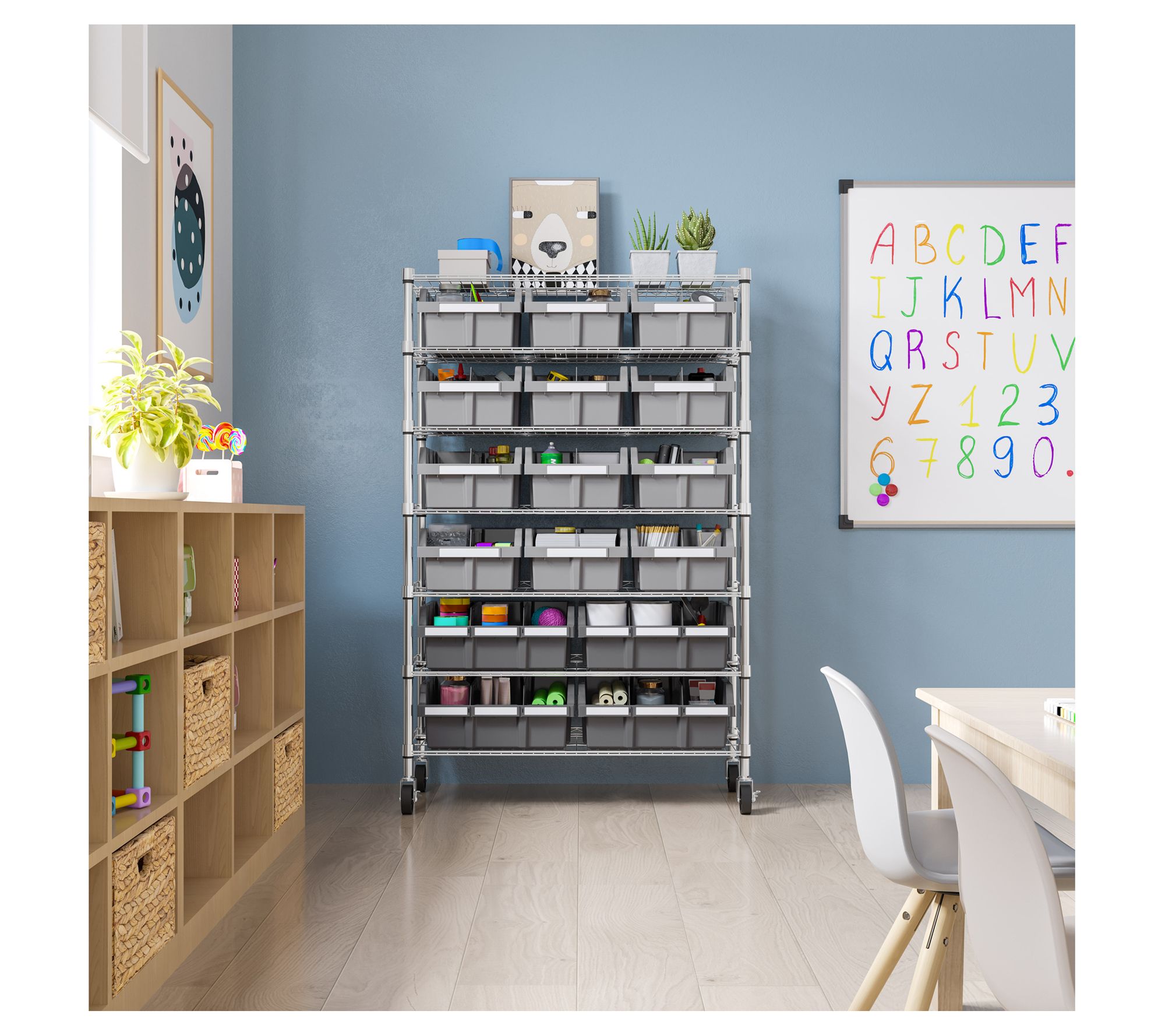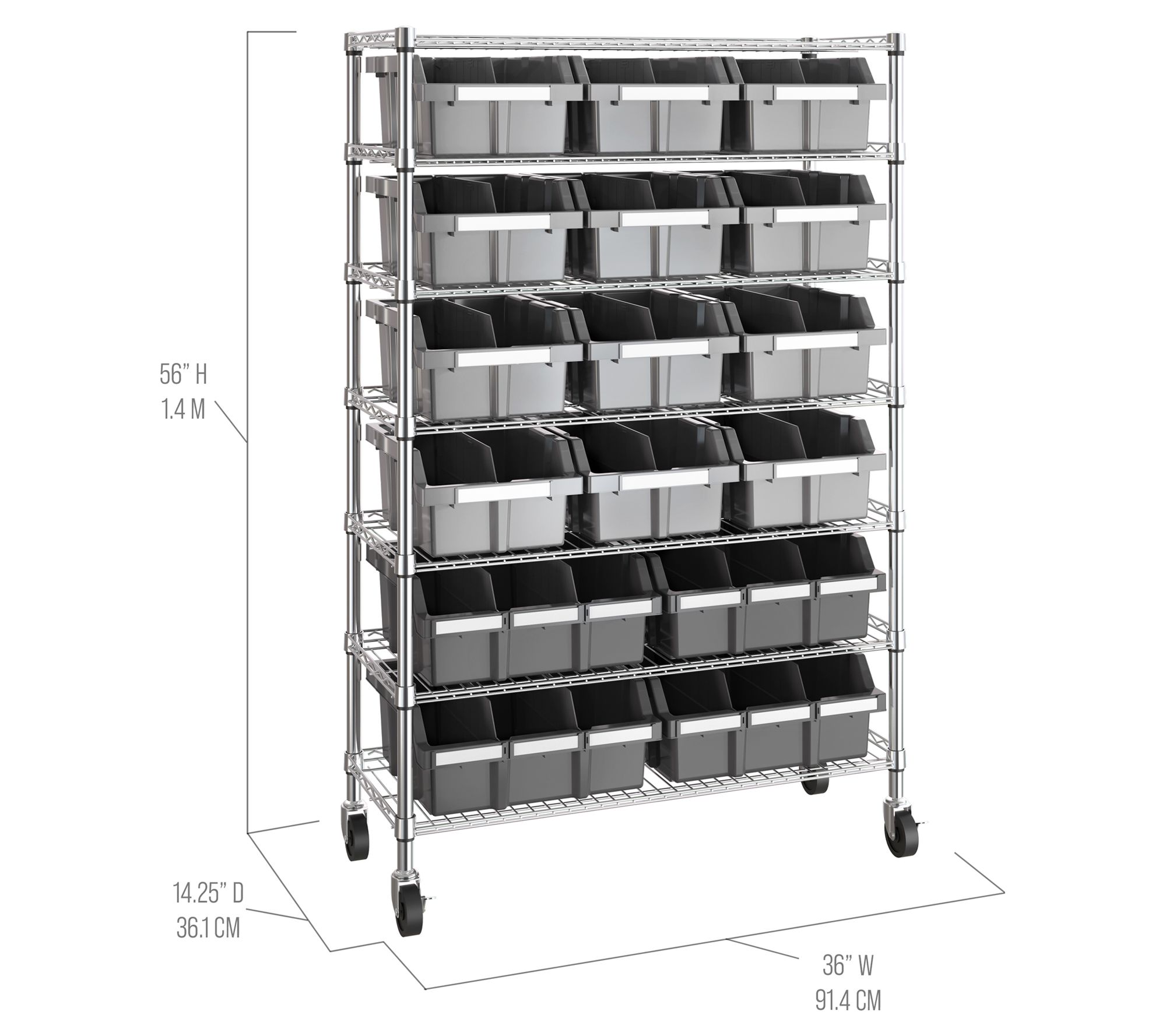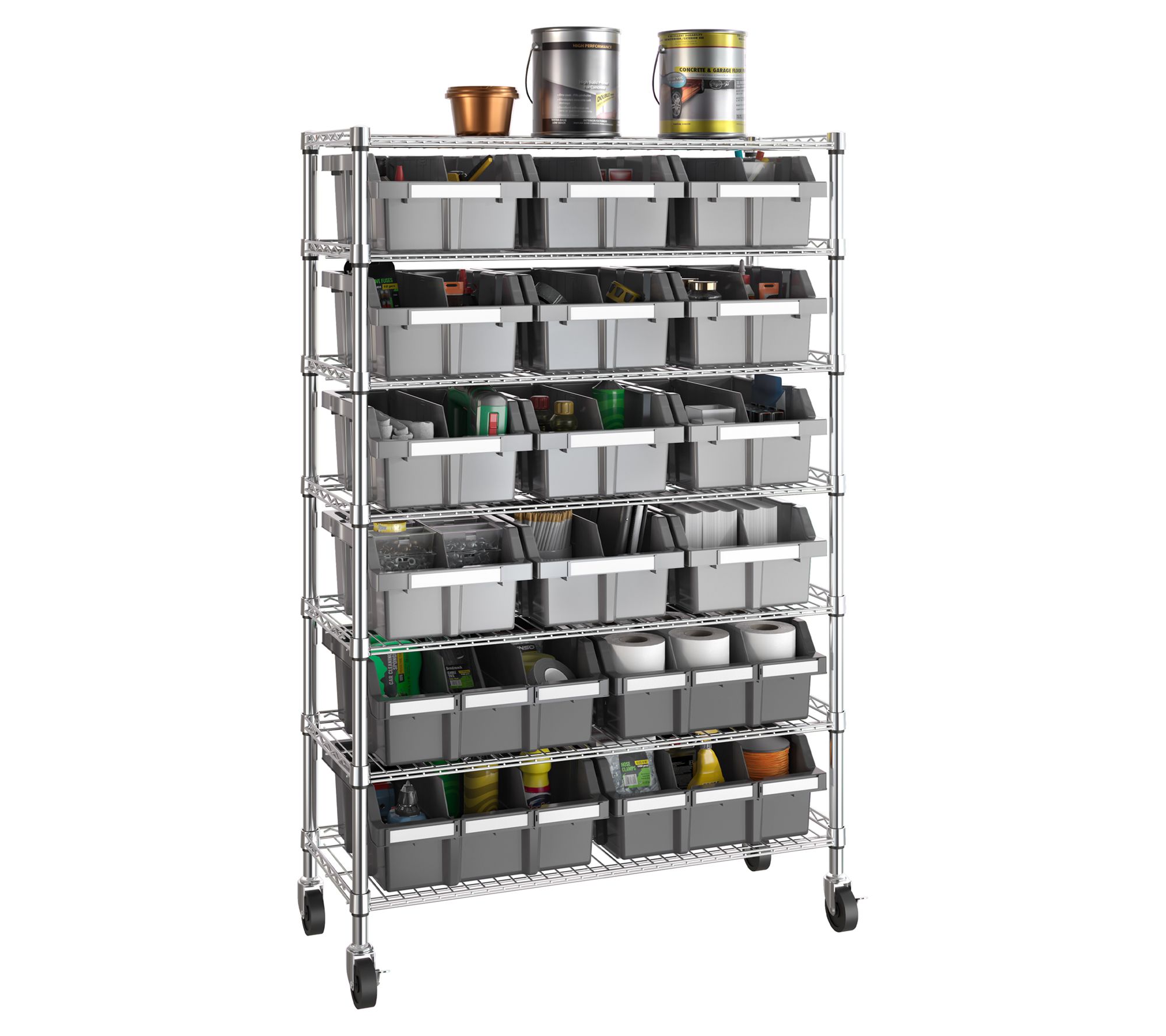 • Includes seven steel wire shelves, eight steel poles, four XL gray bins, 12 large gray bins, four 3" wheels, four adjustable leveling feet, 30 bin labels, and 28 slip-sleeves