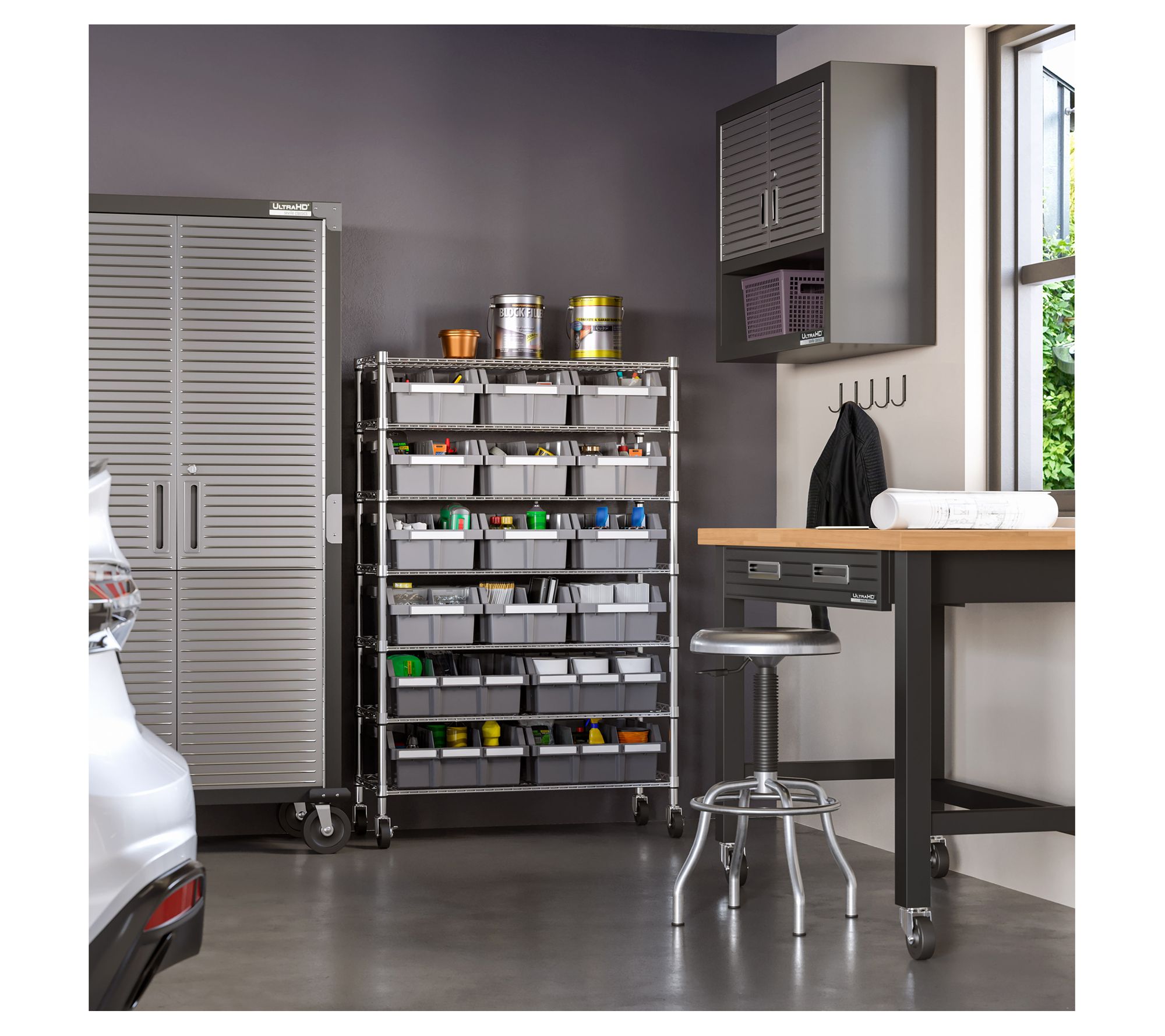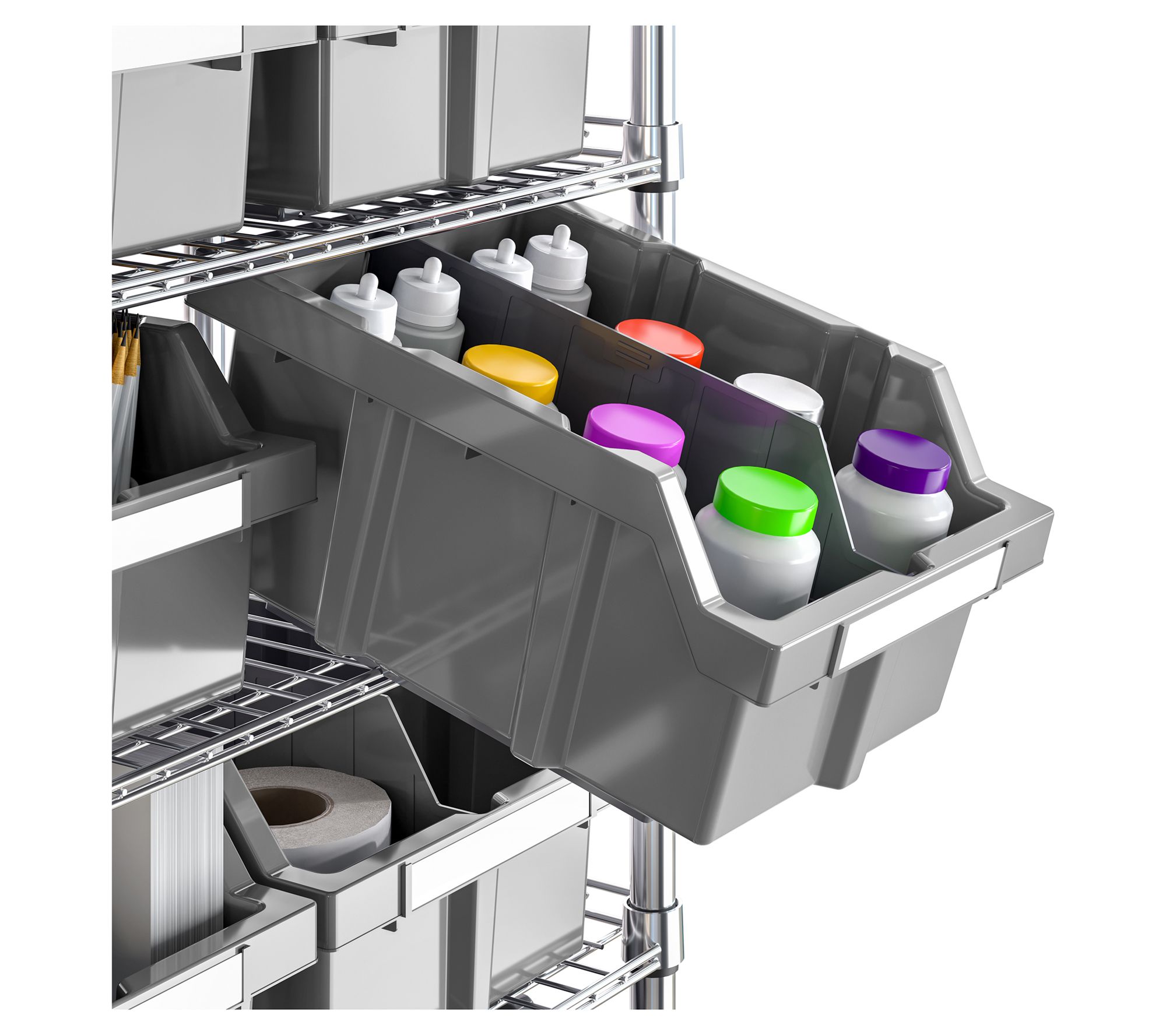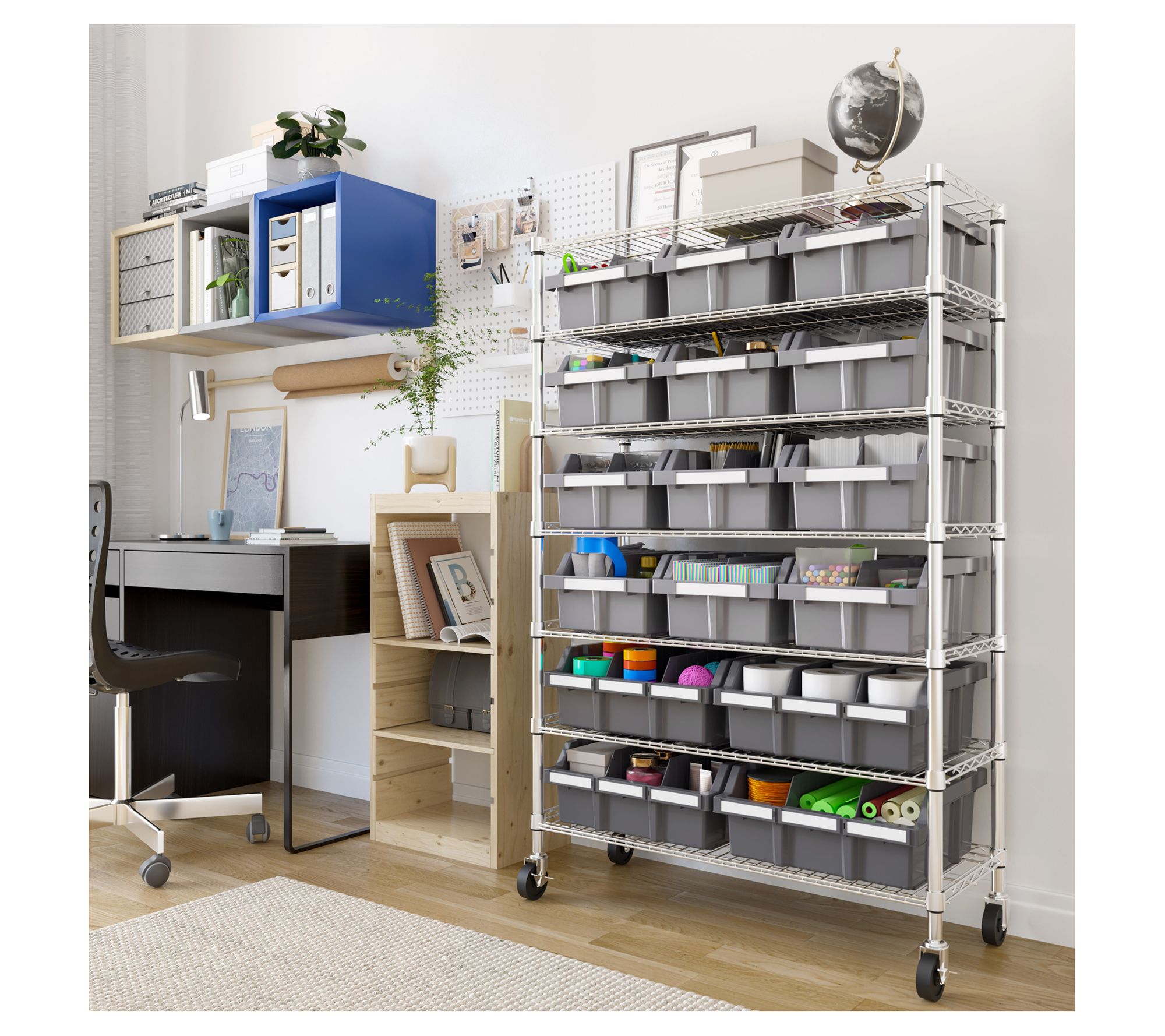 • Includes seven steel wire shelves, eight steel poles, four XL gray bins, 12 large gray bins, four 3" wheels, four adjustable leveling feet, 30 bin labels, and 28 slip-sleeves