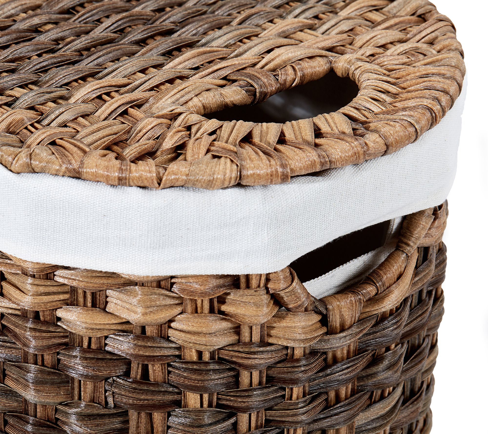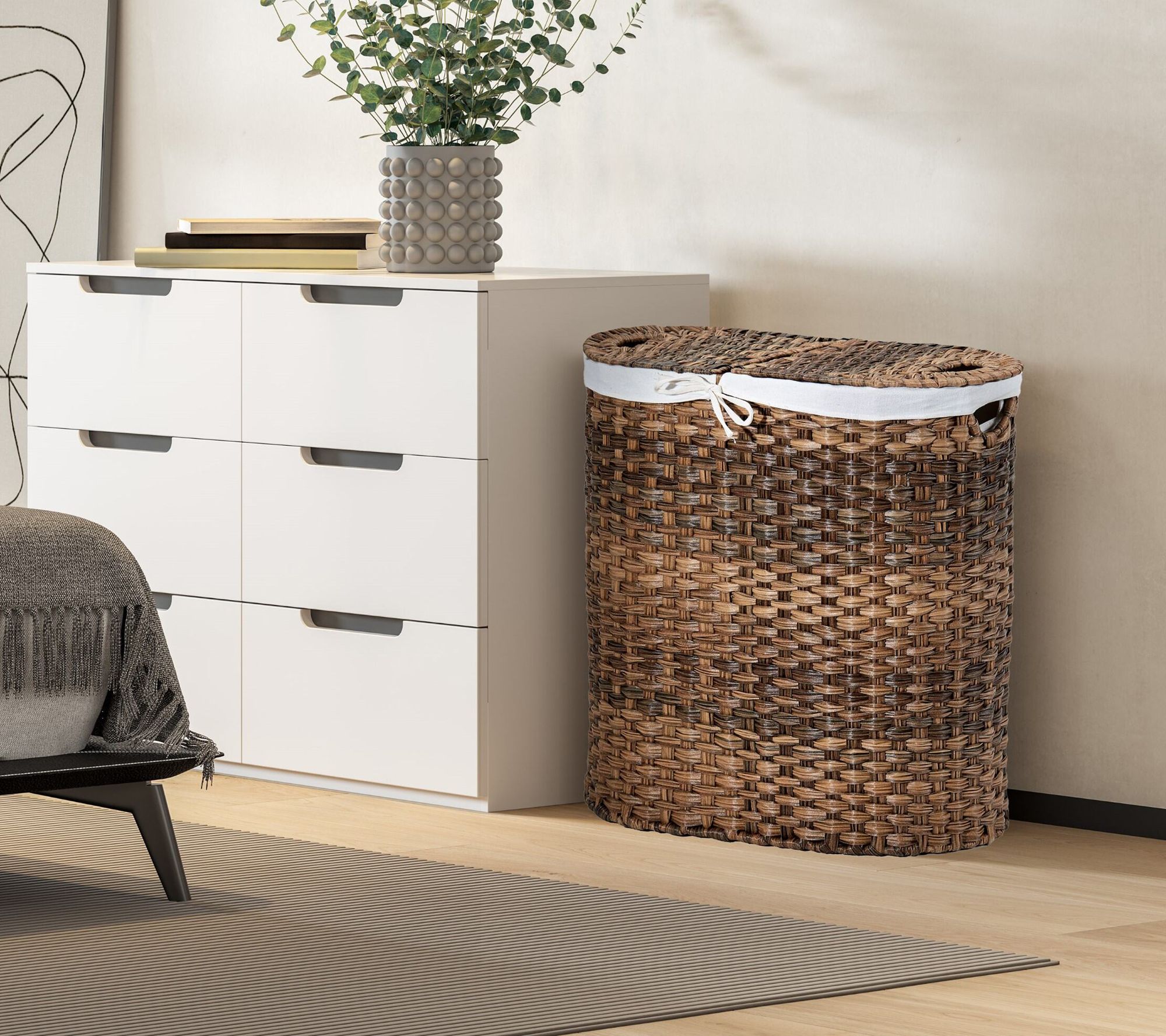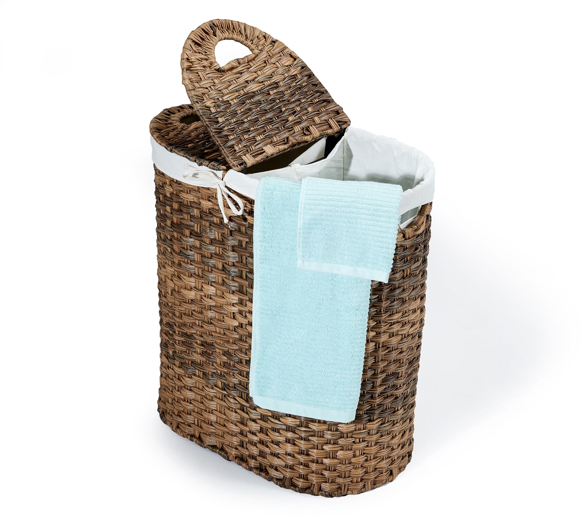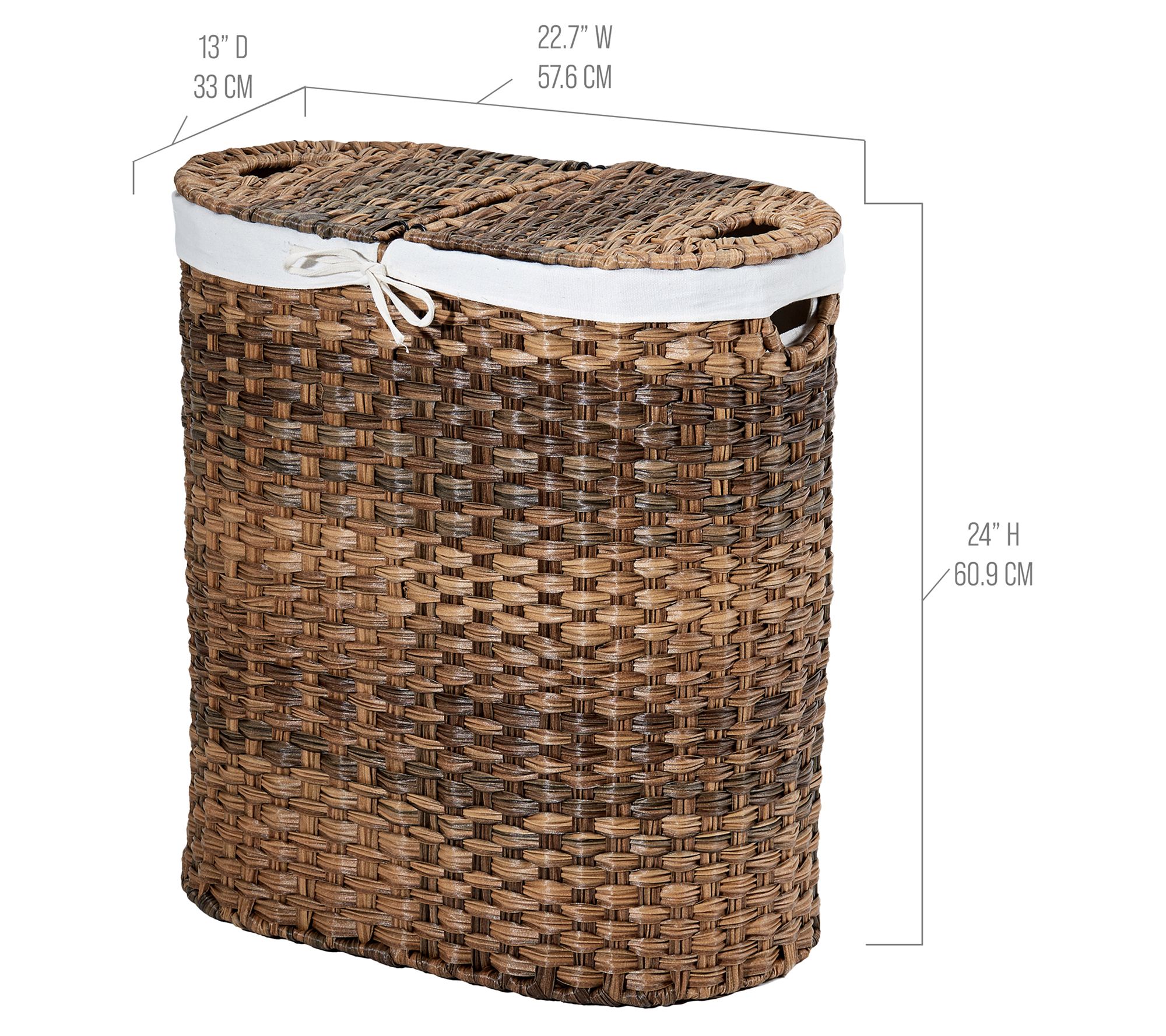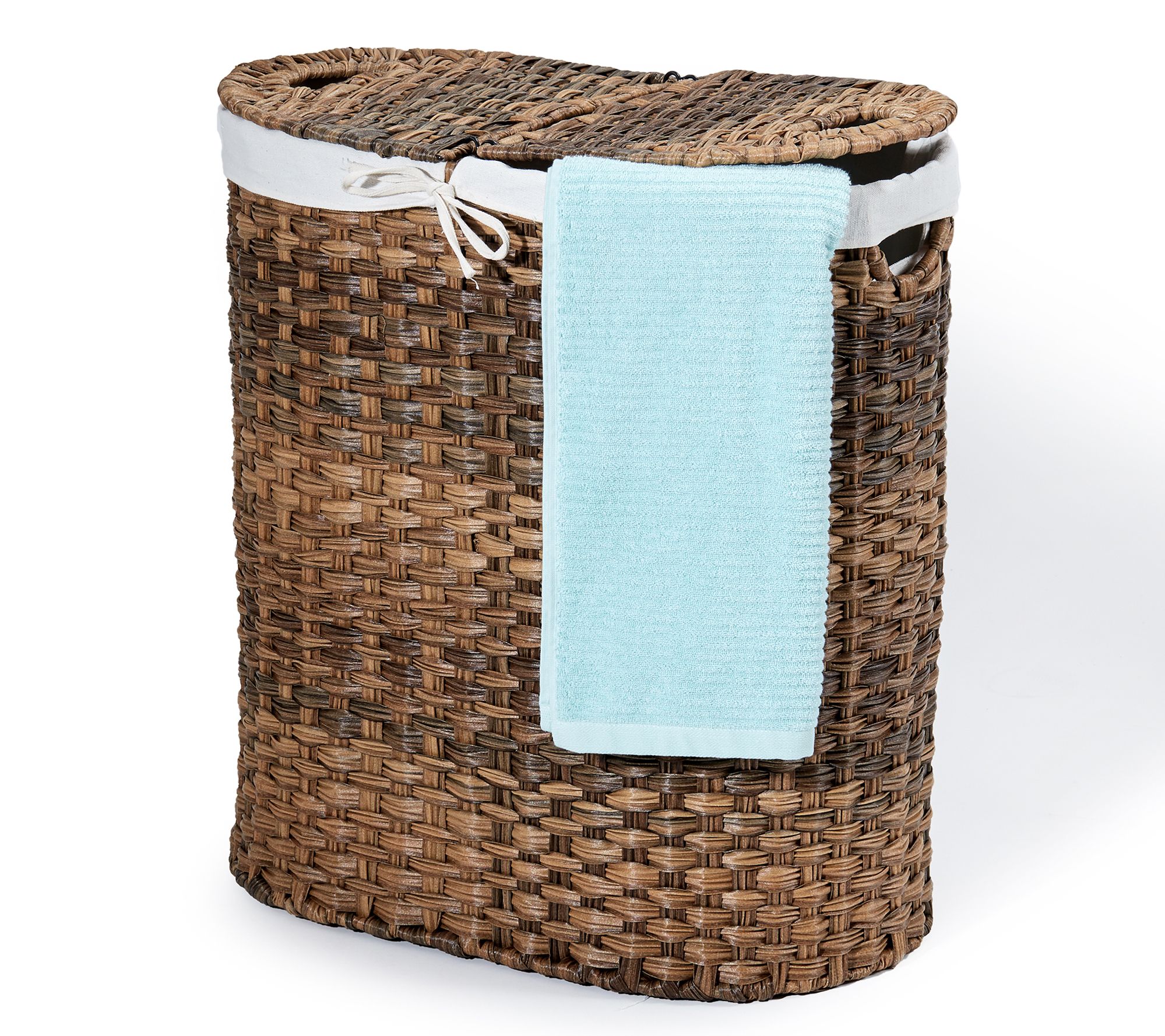 Seville Classics woven lidded oval double laundry hamper combines style and practicality, perfect for organizing your laundry. Complete with a sturdy steel frame and two removable, machine-washable polyester bag liners, it makes transporting laundry a breeze. From Seville Classics.