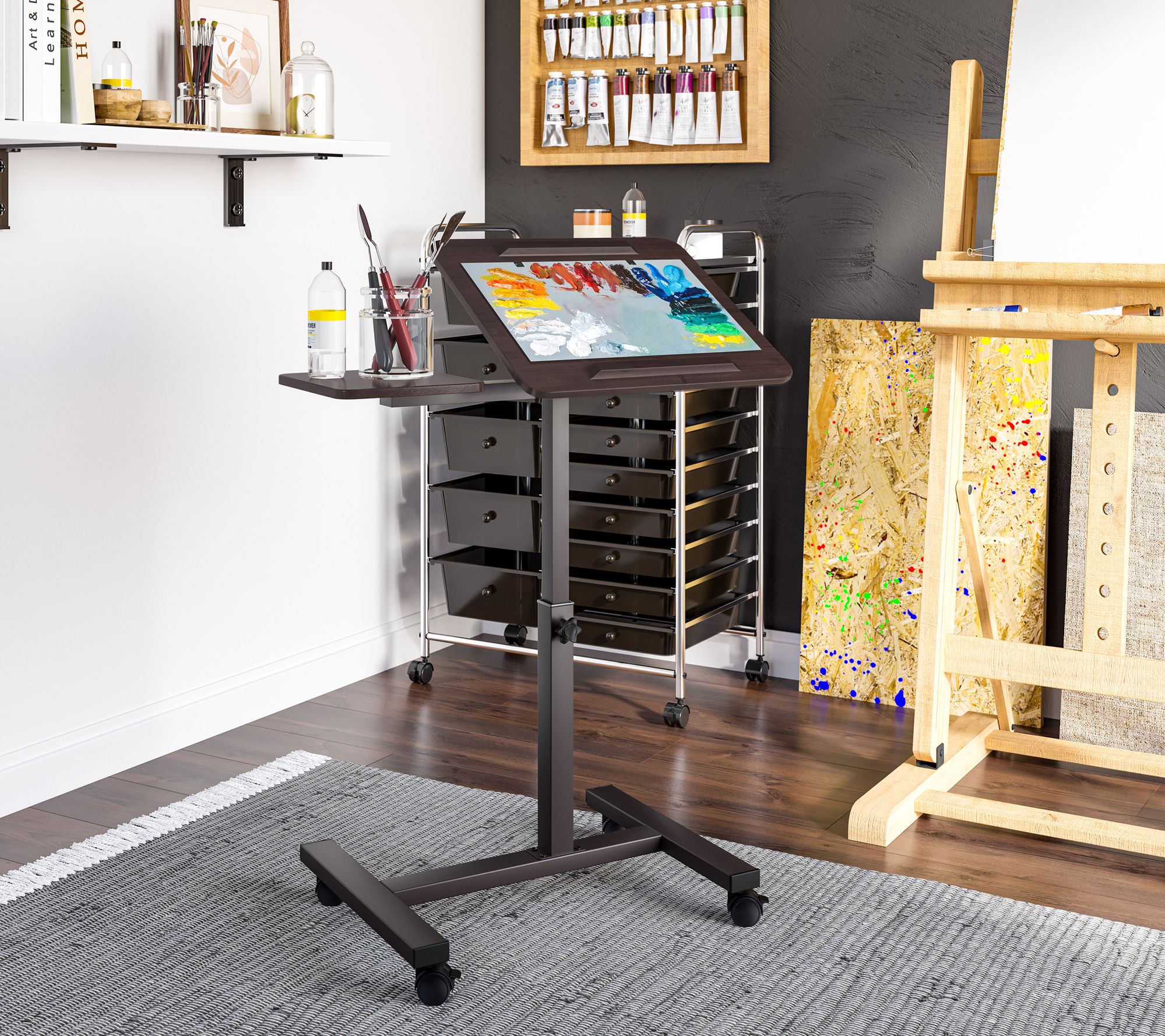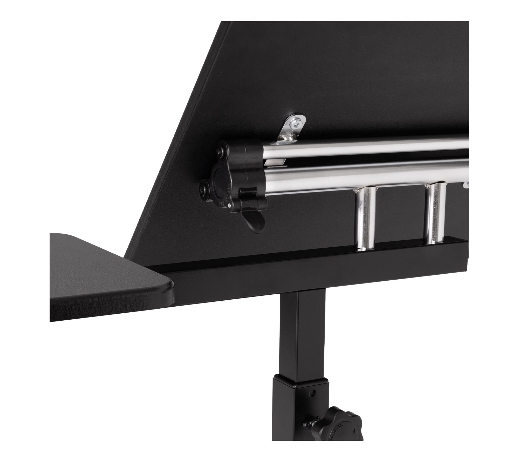Elevate your workspace with the Seville height adjustable tilting sit-stand computer desk cart. Designed for comfort and versatility, this desk allows you to lift or lower the tabletop to your preferred height, making it ideal for writing, drawing, or laptop use. From Seville.