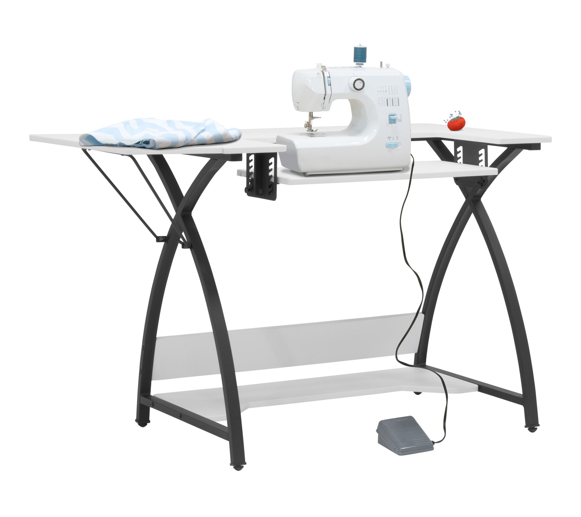 Find inspiration for your next masterpiece at this sewing and office table, thoughtfully designed with a fold-down top -- ideal for spreading out patterns, art supplies, or even dual computer monitors. Its adjustable platform shelf and dedicated lower storage make organizing your creative space simple, so you can effortlessly switch between sewing projects or office tasks. From Sew Ready.