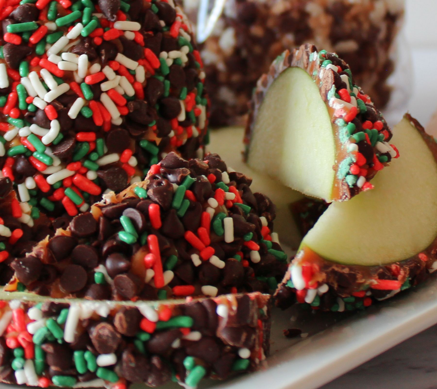 Includes three milk chocolate chip and holiday sprinkle apples, three white chocolate chip and holiday sprinkle apples, and three dark chocolate chip and holiday sprinkle apples