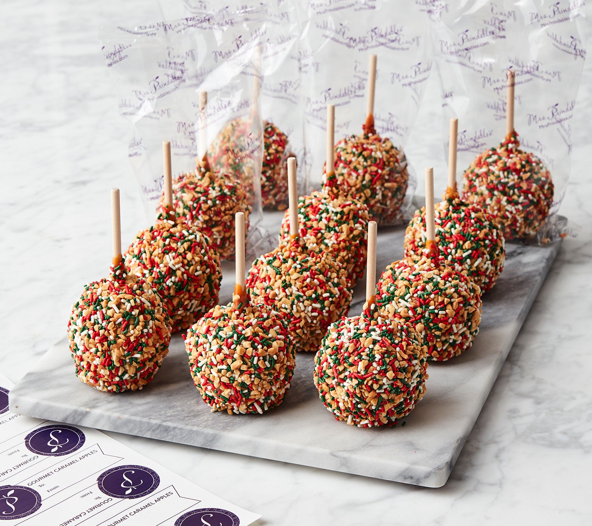 Includes 12 caramel apples dipped in caramel, peanuts, and festive sprinkles