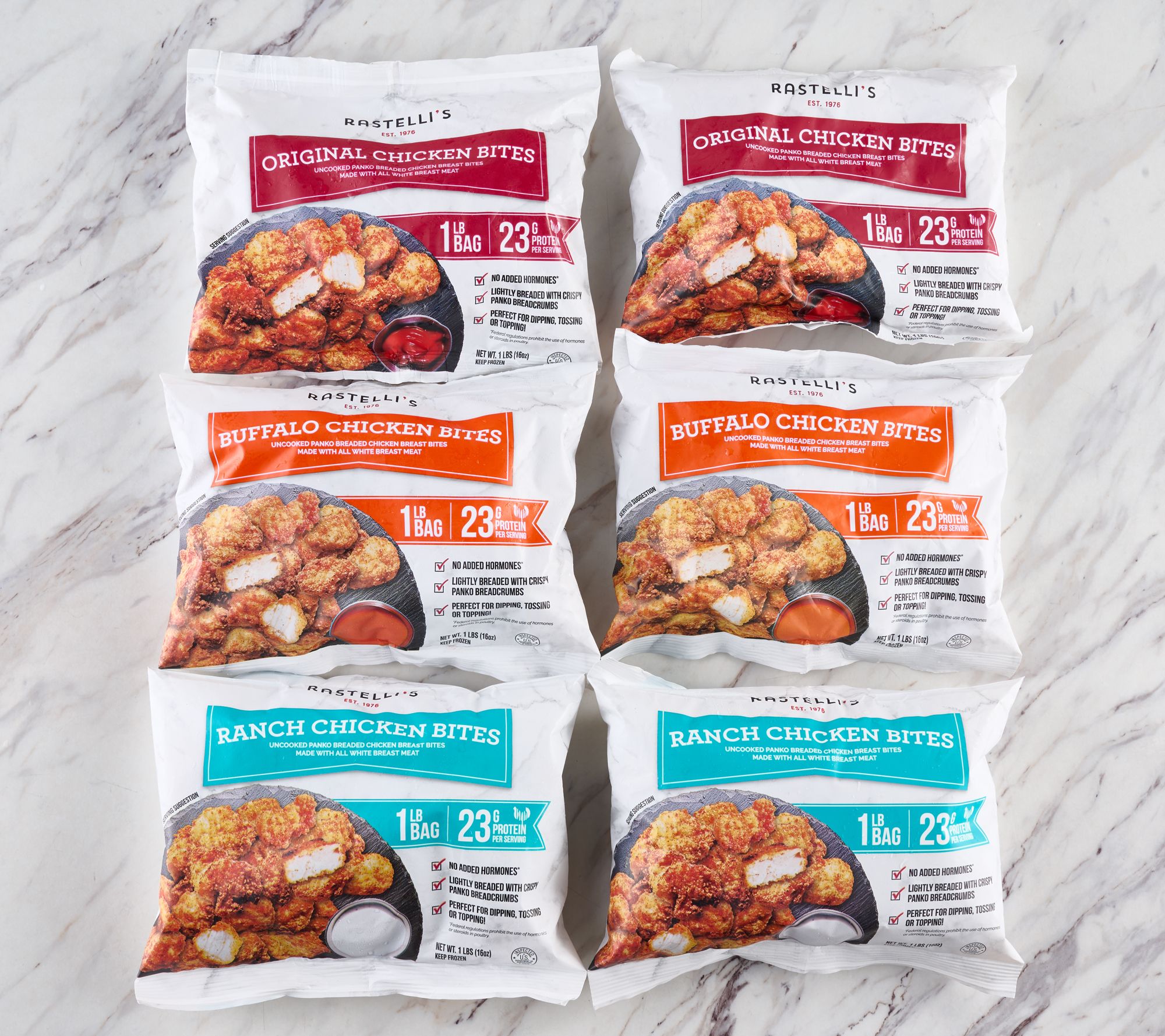 Includes six 1-lb bags of white meat chicken bites