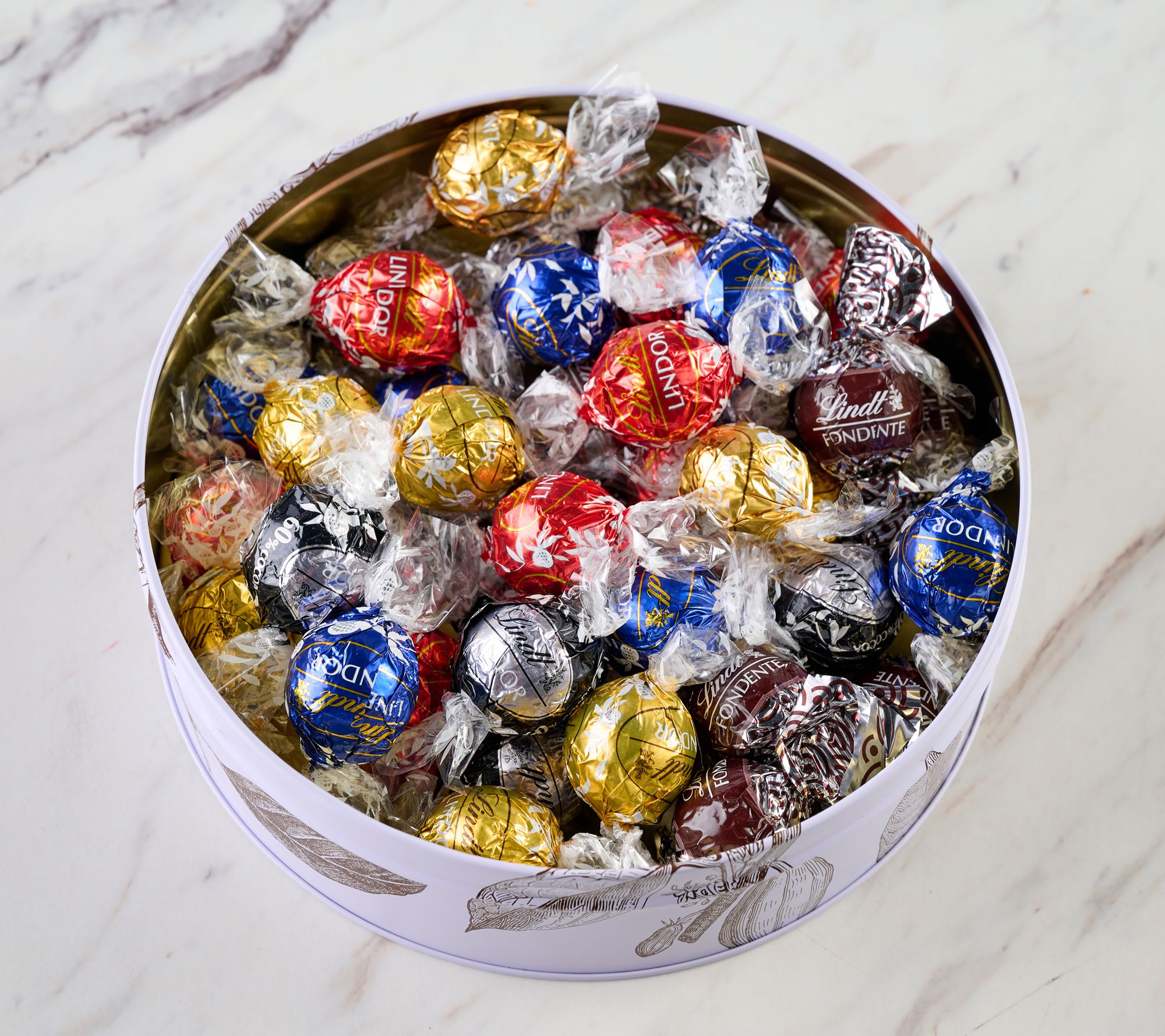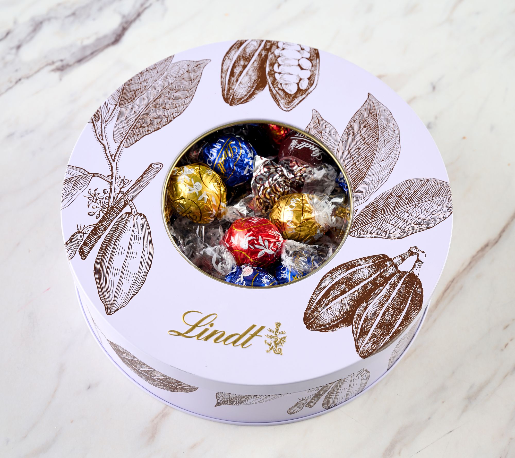 Celebrate chocolate moments with this Lindt truffle and roulette mix-in tin -- offering a luxurious assortment for casual snacking or special get-togethers. Rich dark and milk chocolate, creamy white chocolate, and decadent 60% cocoa truffles along with crunchy hazelnut dark chocolate roulettes are all a tempting indulgence, whether shared at parties or enjoyed with evening coffee. From Lindt.