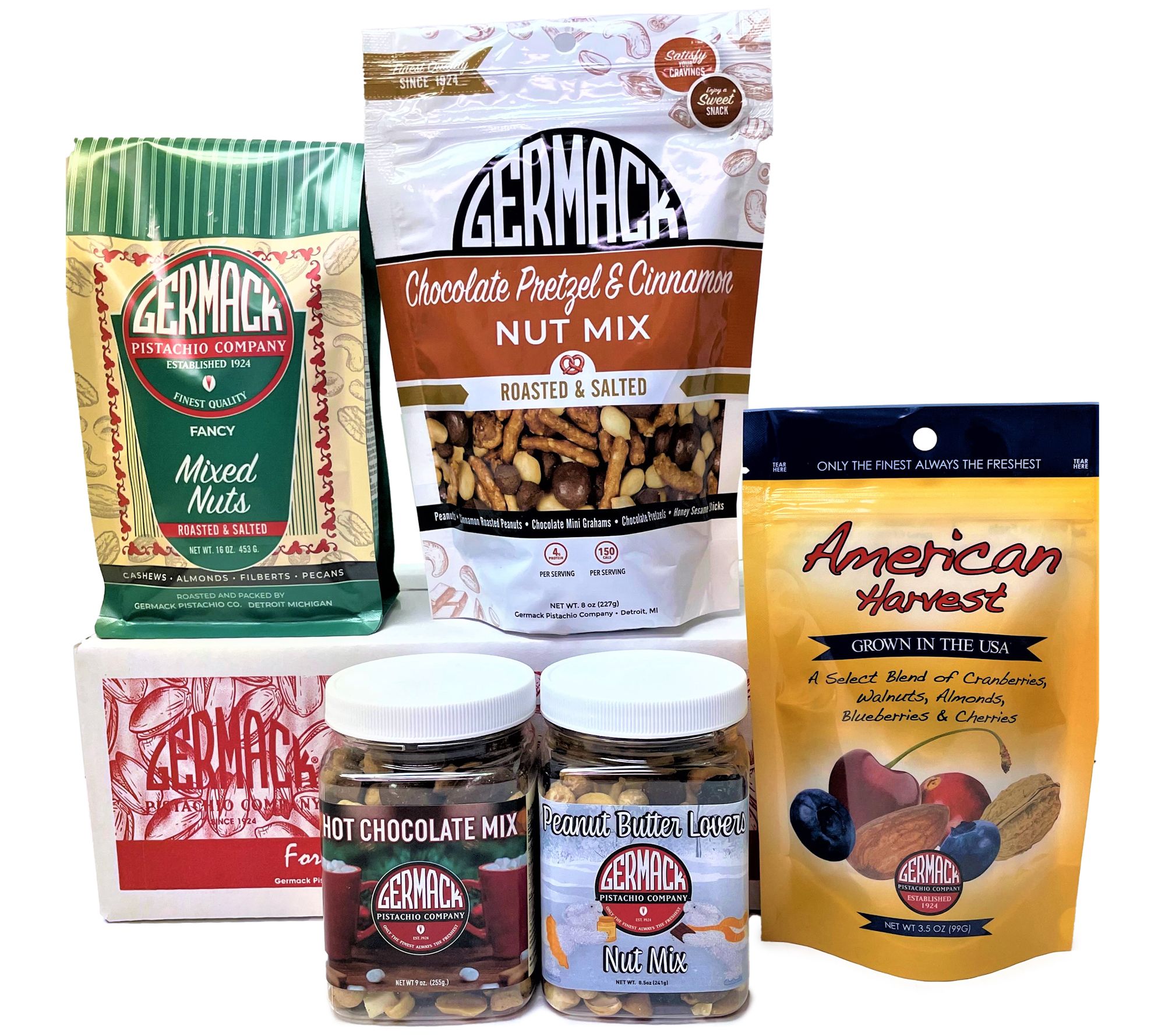 • Includes 16-oz bag of mixed nuts, 8-oz bag of chocolate pretzel & cinnamon, 9-oz mini jar of hot chocolate, 8.5-oz mini jar of Peanut Butter Lovers, and 3.5-oz pouched bag of American Harvest