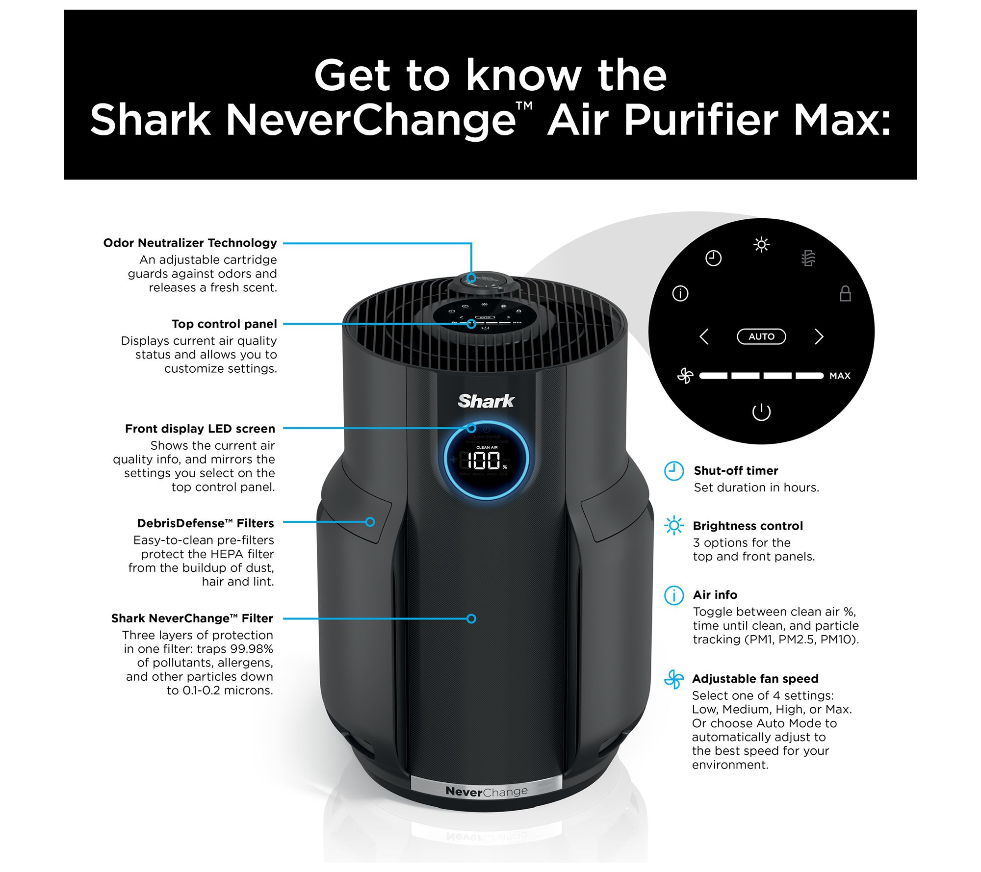 • Includes Shark air purifier, Shark NeverChange HEPA filter, and Odor Neutralizer Technology cartridge