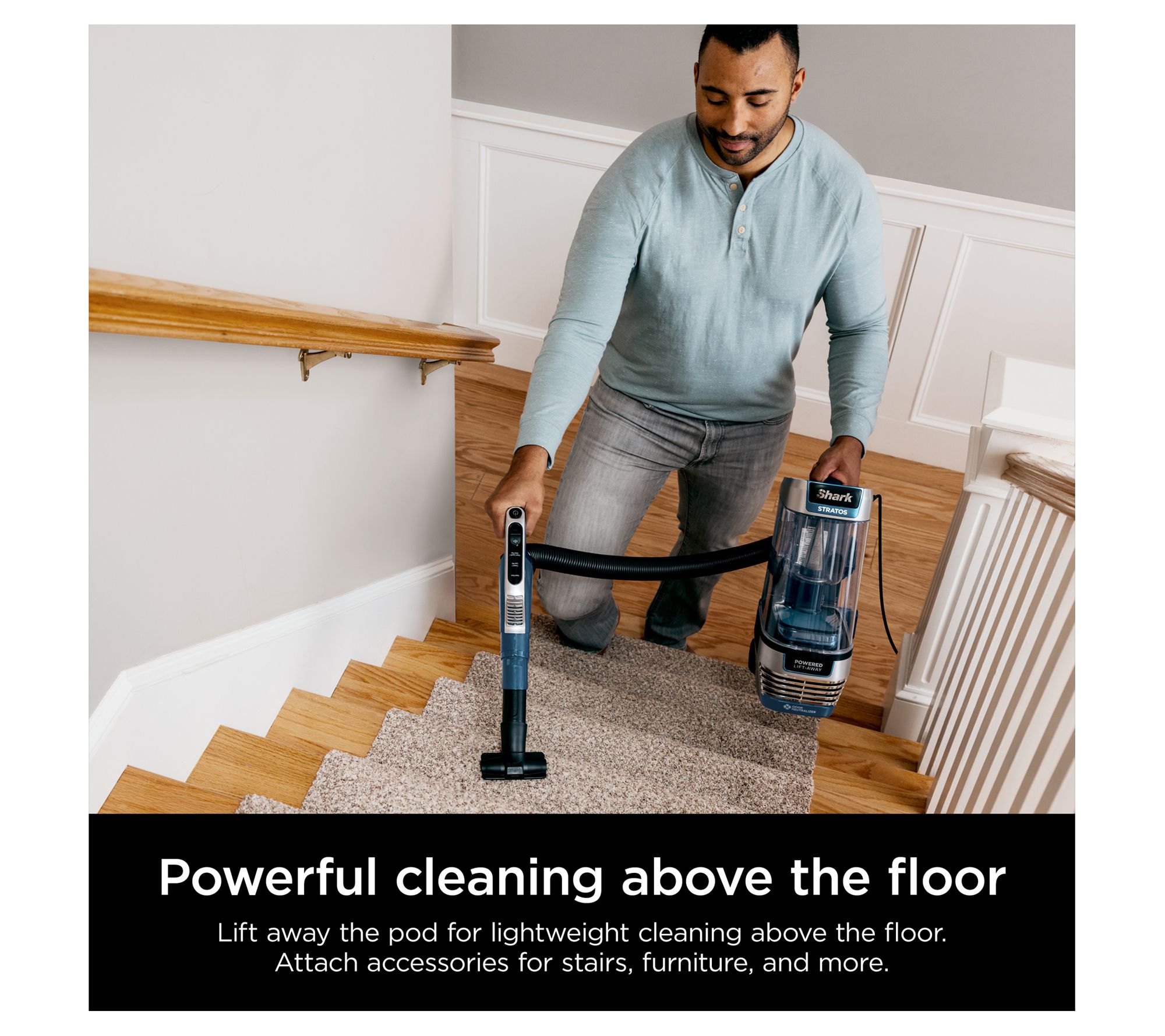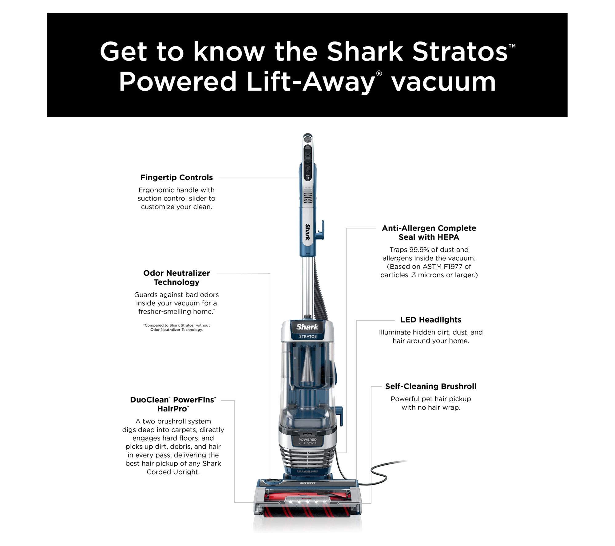 Includes Shark Stratos Upright Vacuum, DuoClean PowerFins HairPro nozzle, and additional tools