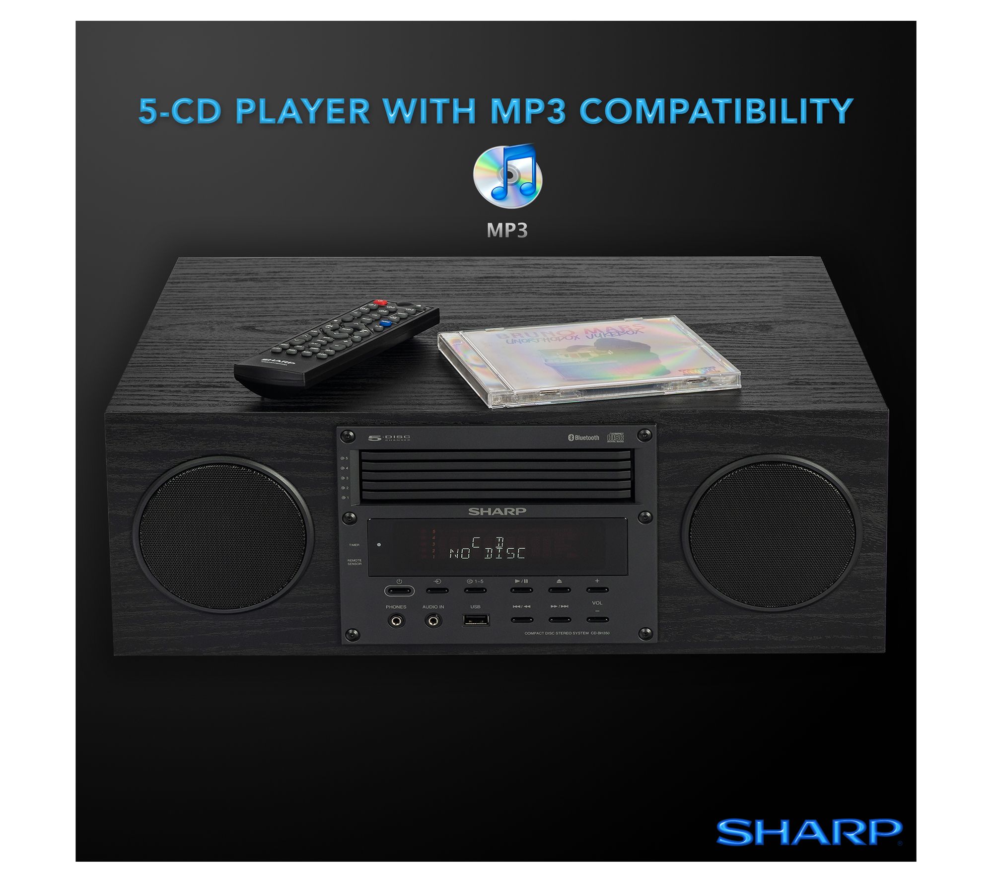 Looking to give your CD collection a comeback tour? The Sharp CD-BH350 compact disc stereo system combines a quintet of CD changers with MP3 compatibility to make it the ultimate playlist partner. With Bluetooth wireless connectivity, a USB port, and a 3.5mm audio input, it's literally a musical jack-of-all-trades! Wrapped in an attractive wood design, it's like a classy concert hall squeezed into your living room -- no tuxedo required. Let its 50W digital amplifier serenade you; the CD-BH350 promises pitch-perfect audio for both mellow lounge sessions and all-out dance-offs with the kids! From Sharp.