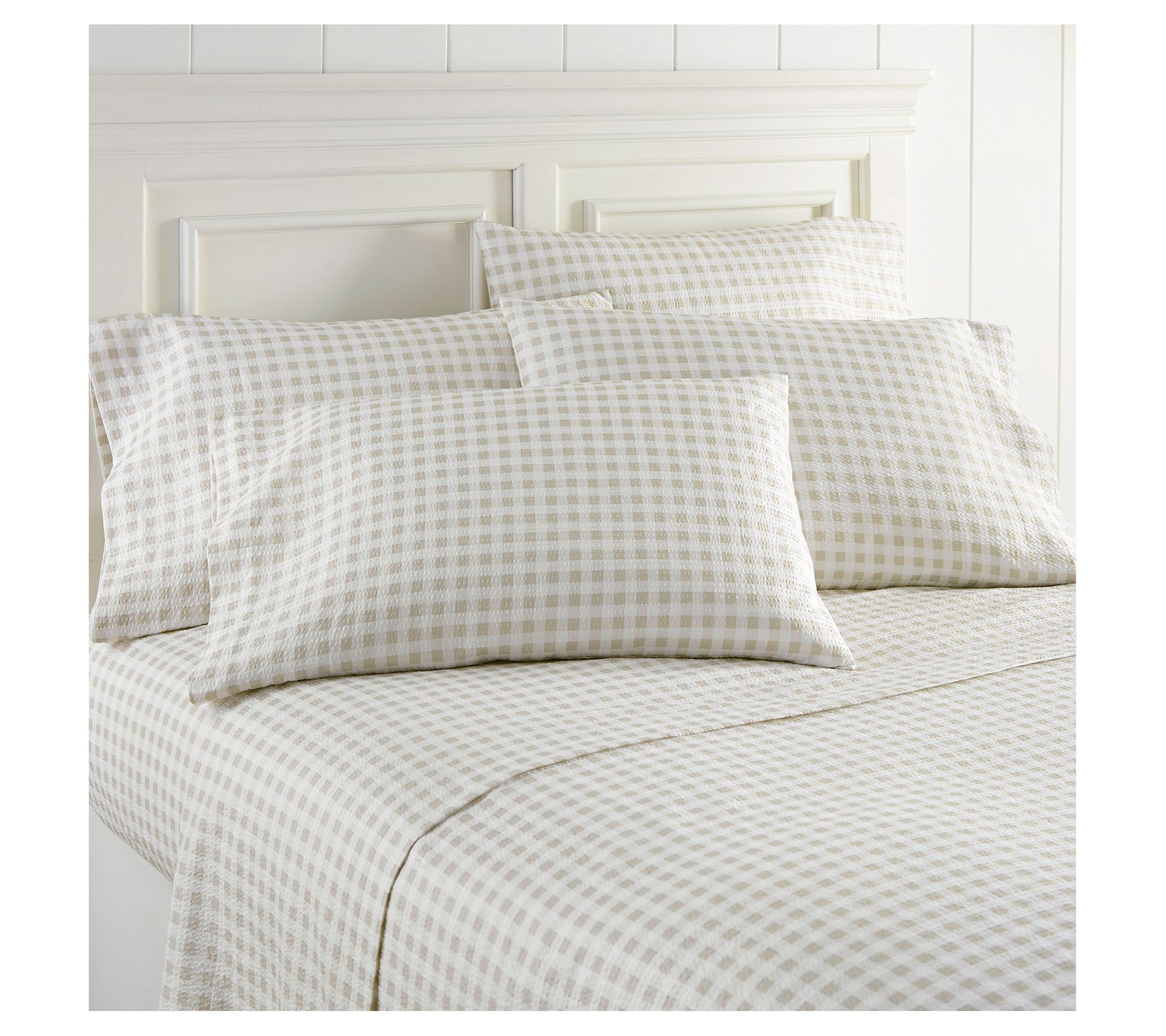 Drift into a serene slumber with this seersucker sheet set, where style meets comfort in a design perfect for refreshing your bedroom for Spring and Summer. From Shavel Home.