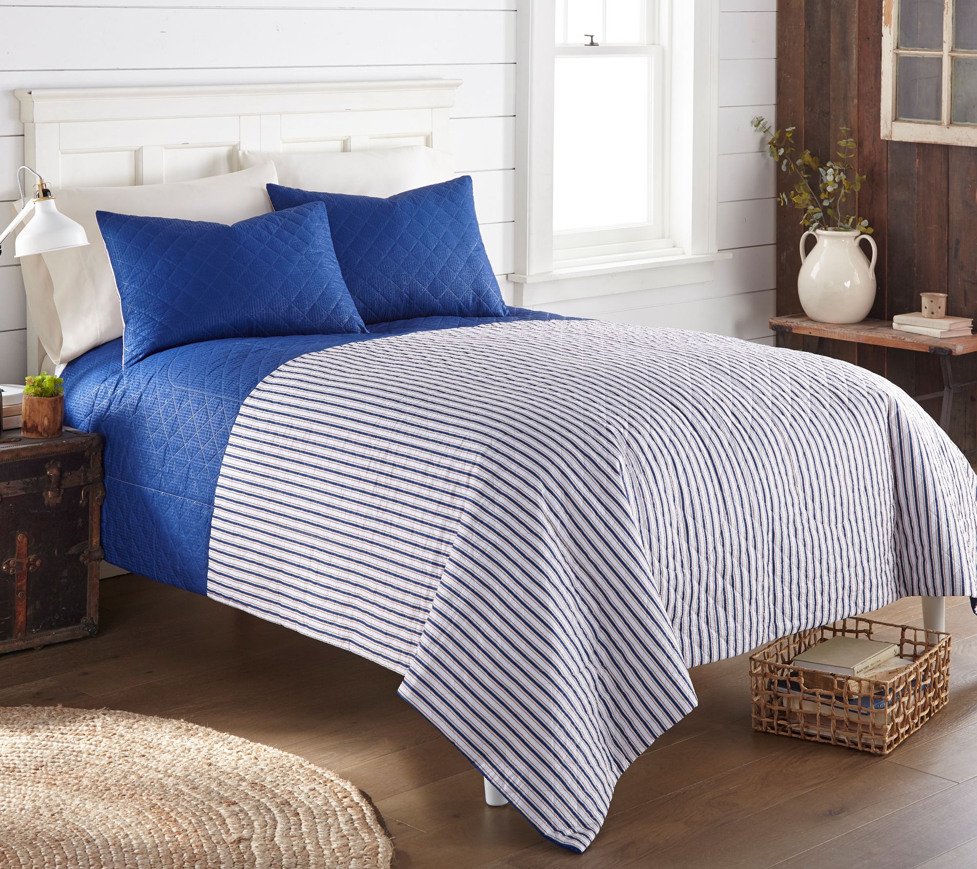 So fresh for spring and summer months, this seersucker quilt set offers up to six different looks, thanks to a stripe print that reverses to a solid color on the quilt and sham. From Shavel.