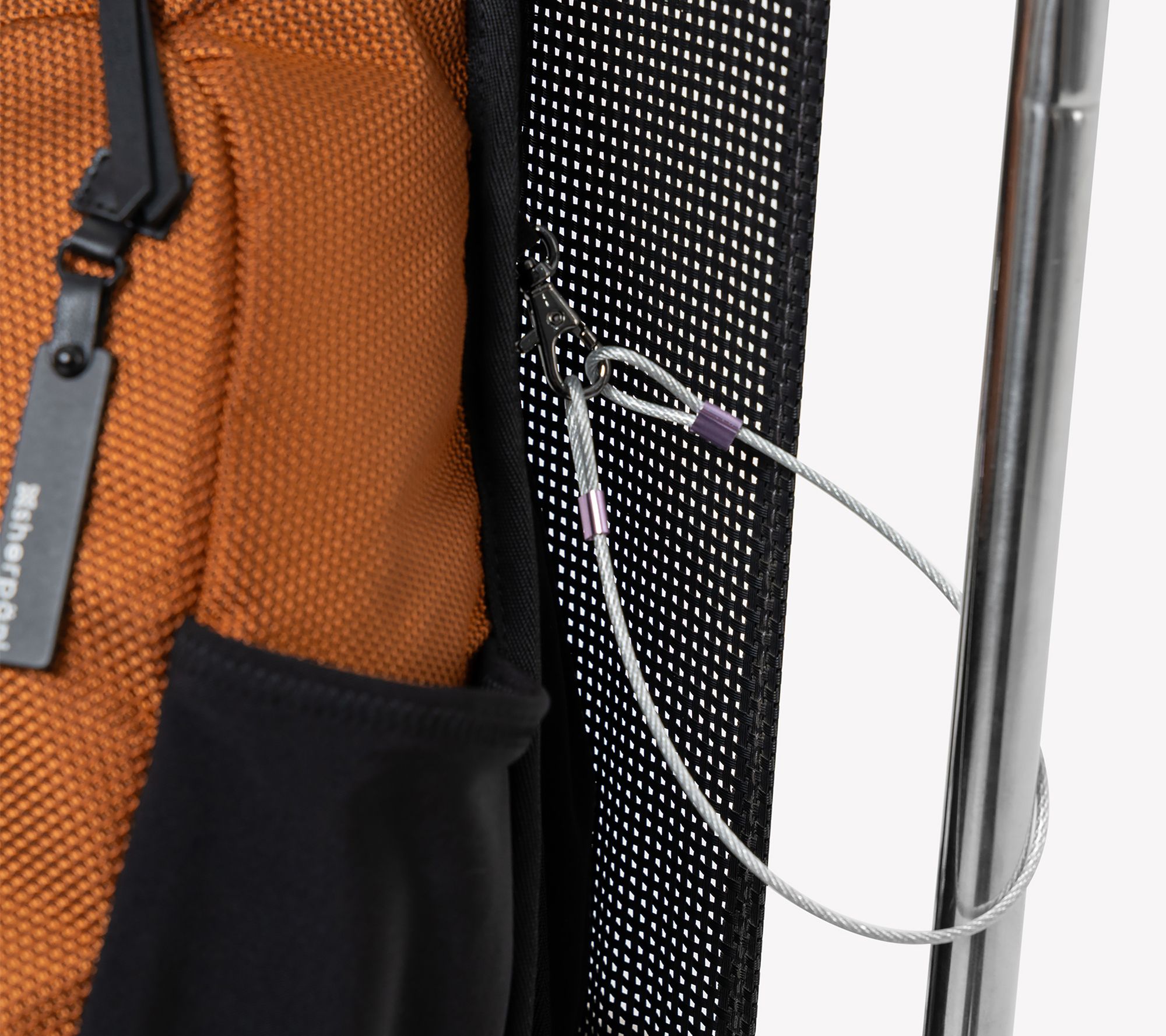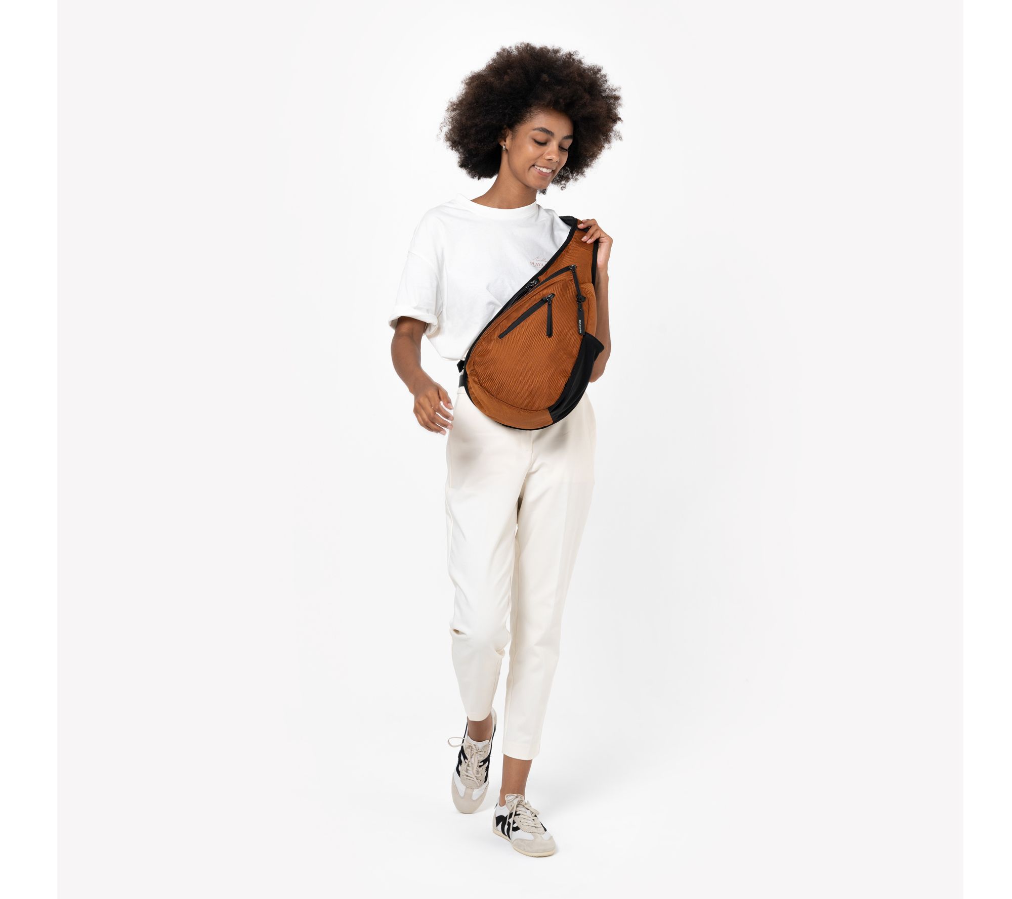Zip top closure, single adjustable sling backpack strap, locking zippers, anti-theft slash-proof bottom and strap, chair loop lock, front zippered pocket with key leash, back zippered pocket, bag hanging loop