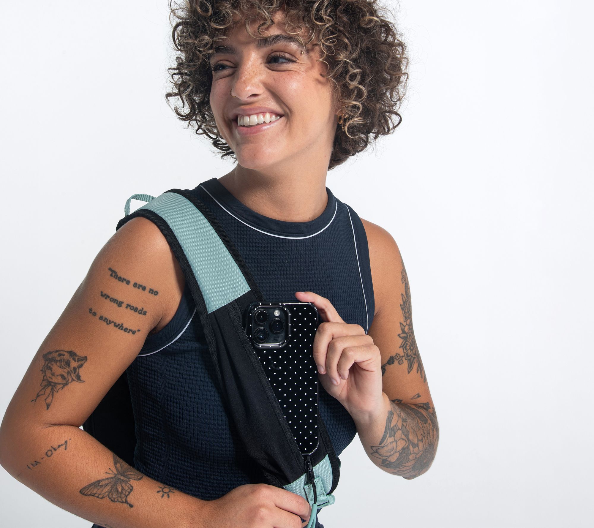 • Water-resistant exterior, 10L capacity, backpack design, adjustable sling strap with zip pocket for phone, easy-access main zip compartment, front zipper pocket, hanging loop