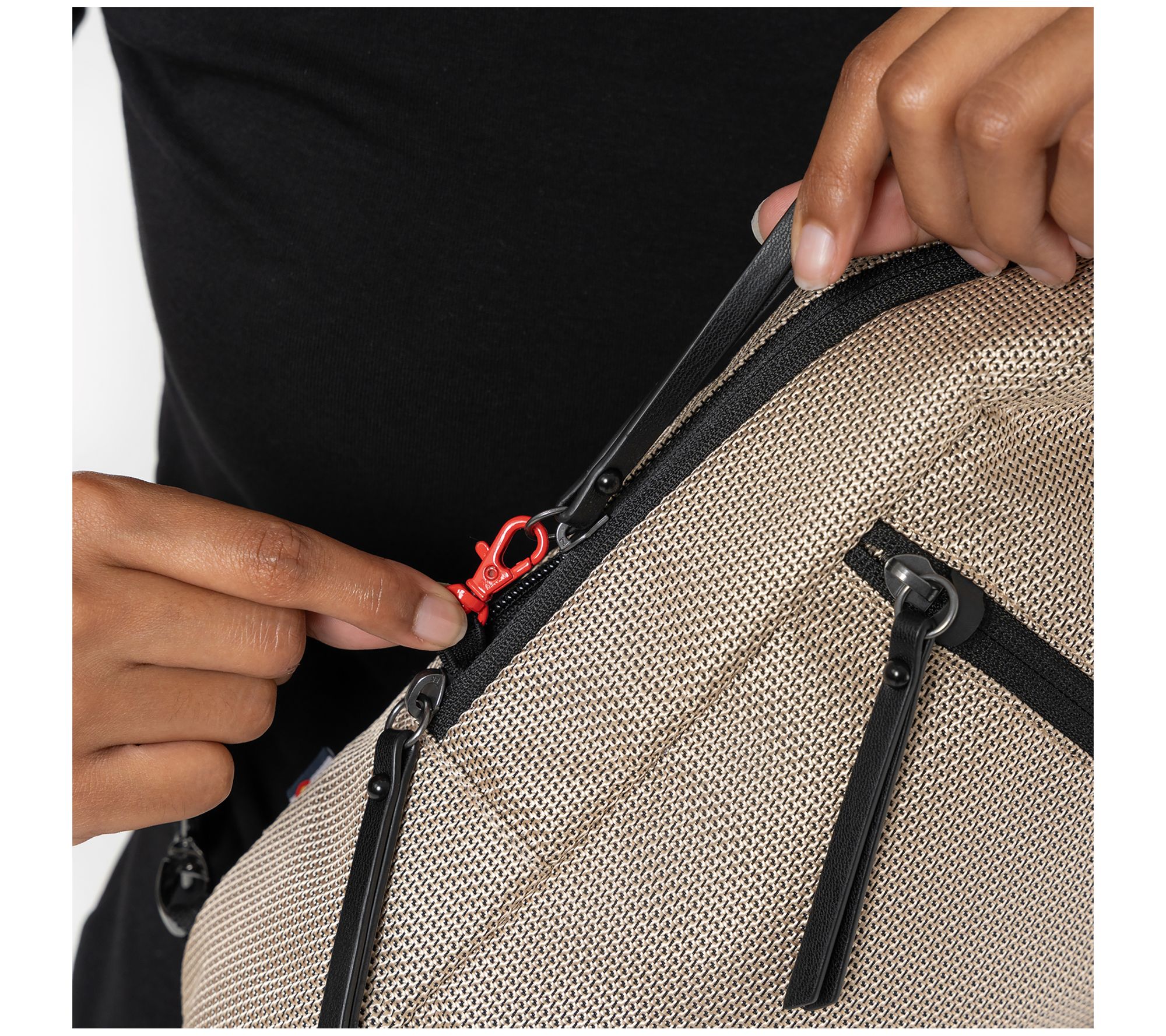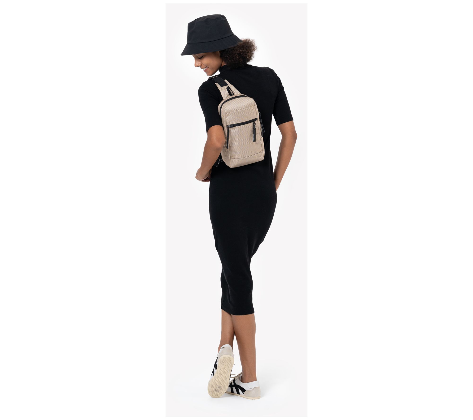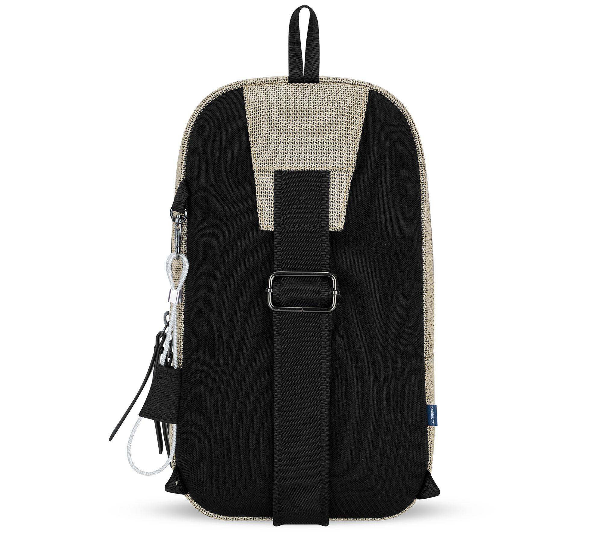 • Zip top closure; single adjustable sling strap; front zippered pocket with key leash; bag hanging loop; metal gunmetal hardware; anti-theft slash-proof bottom and strap; locking zippers; chair loop lock; Hypalon loop zipper lock