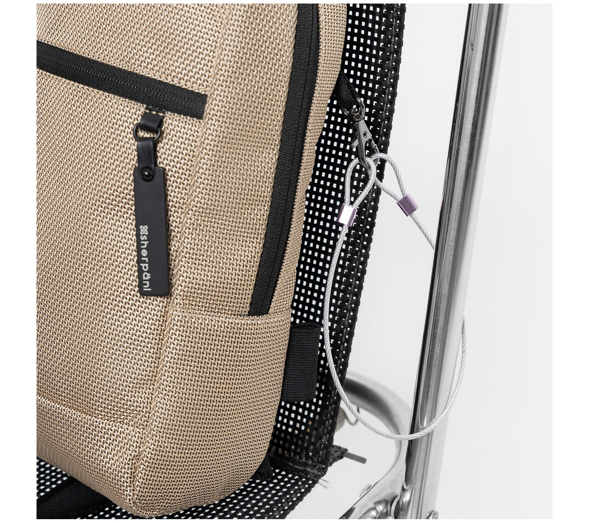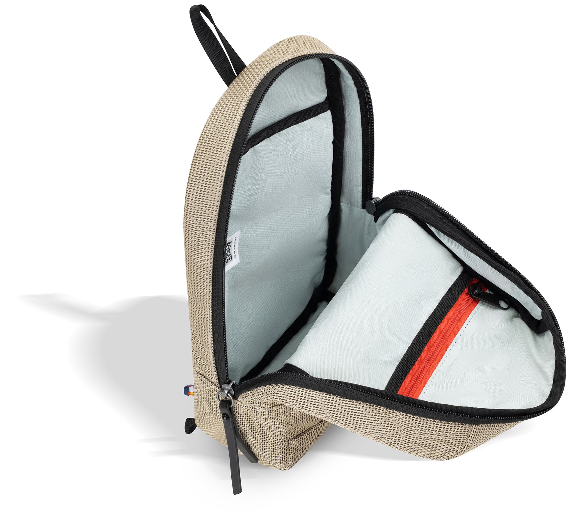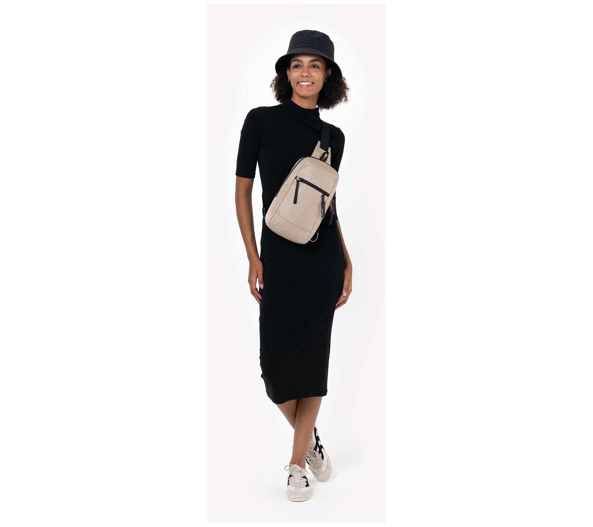 • Zip top closure; single adjustable sling strap; front zippered pocket with key leash; bag hanging loop; metal gunmetal hardware; anti-theft slash-proof bottom and strap; locking zippers; chair loop lock; Hypalon loop zipper lock