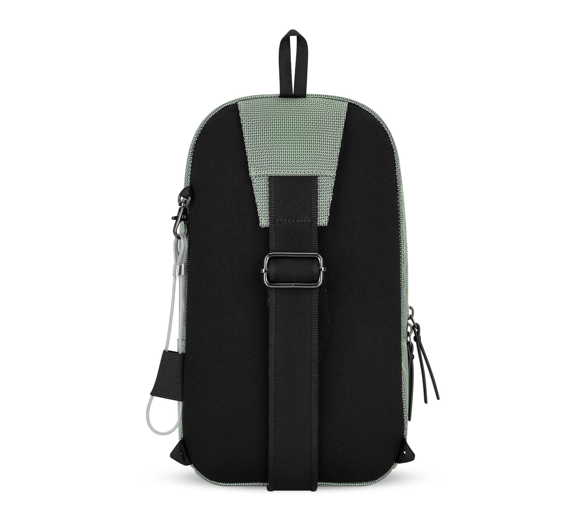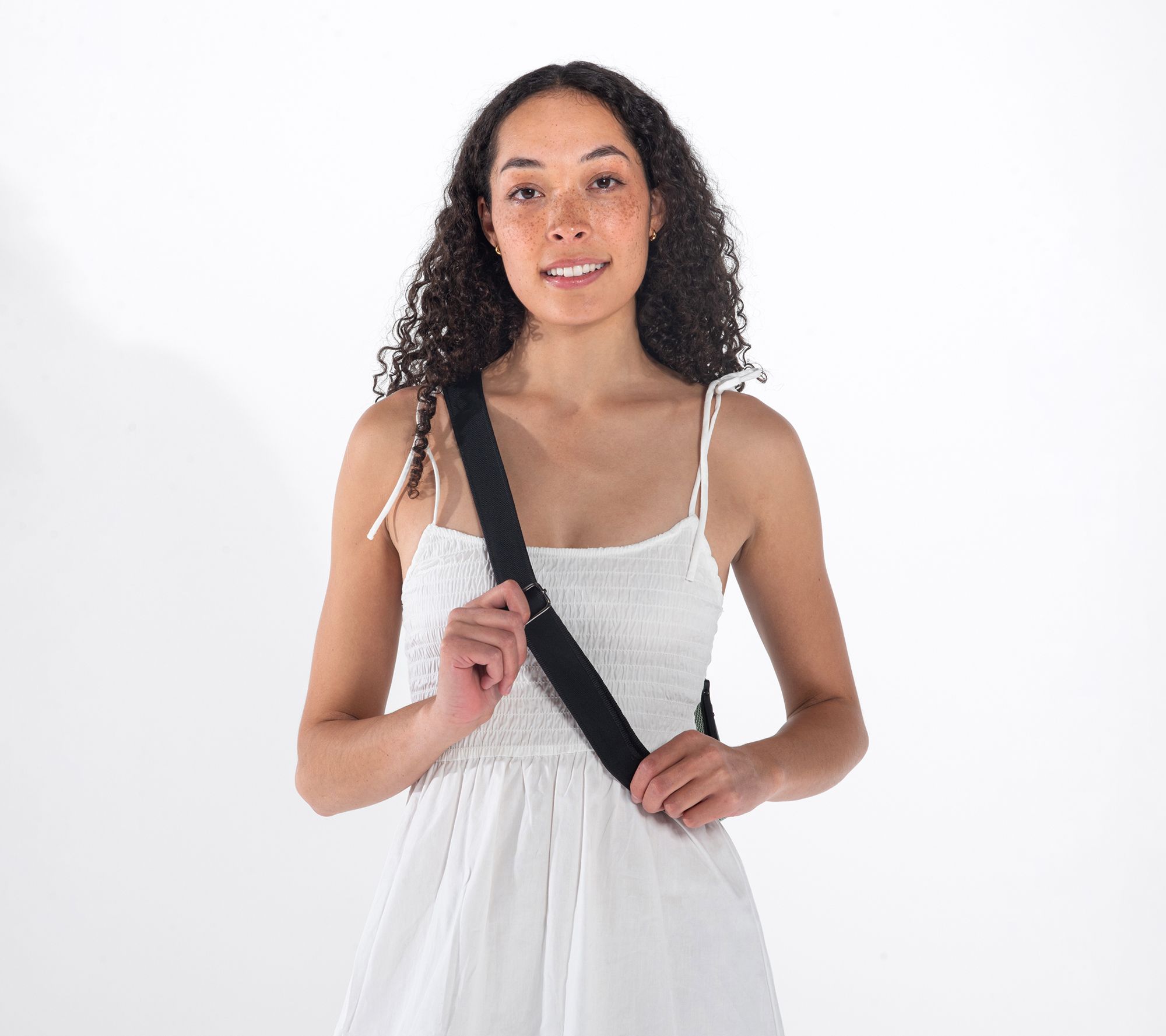 • Reversible sling design; zippered main compartment; adjustable crossbody strap; exterior zippered pocket