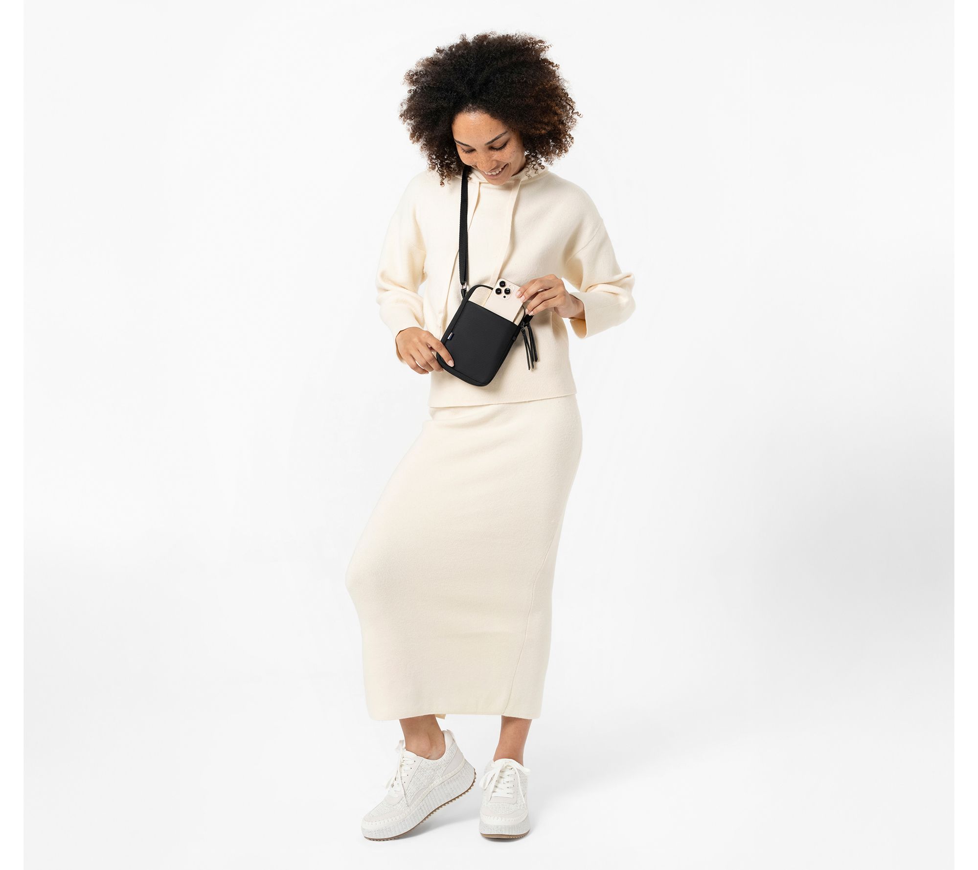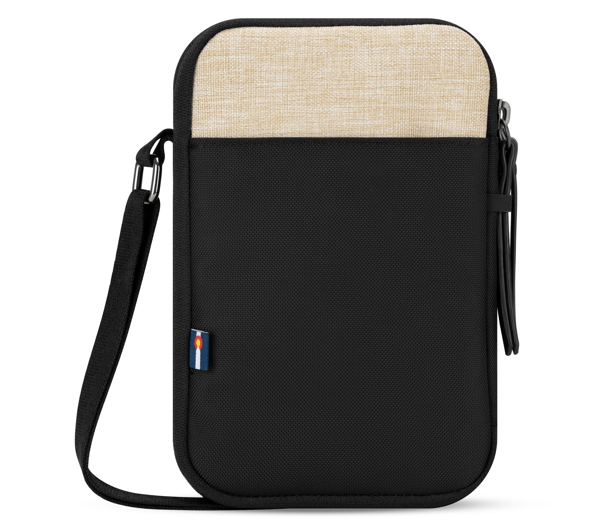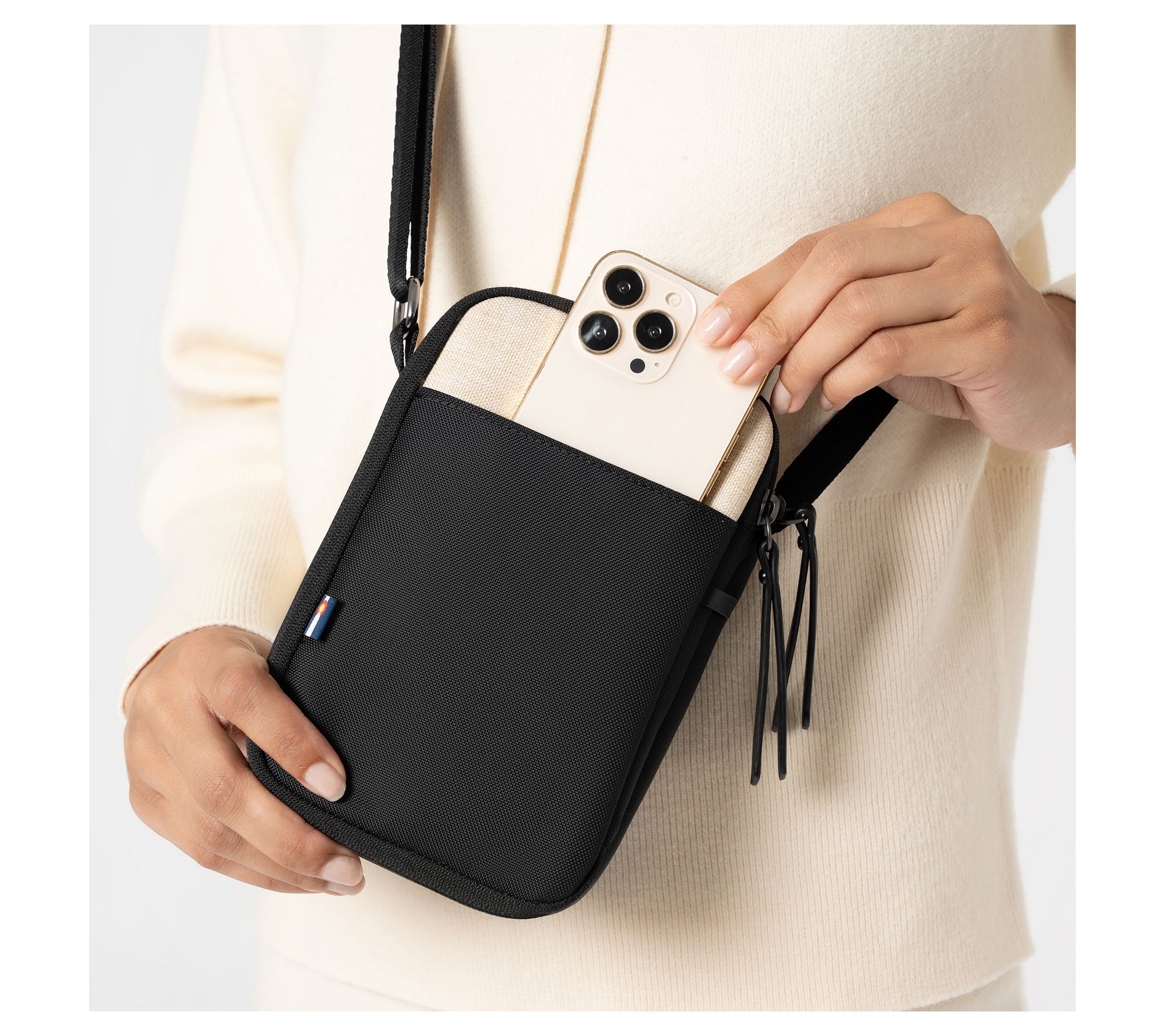 • Crossbody strap, zip top closure, front hidden slip pocket, front zippered pocket with a key leash, back slip pocket