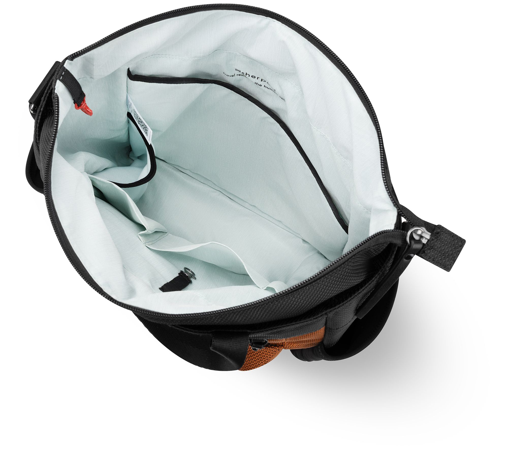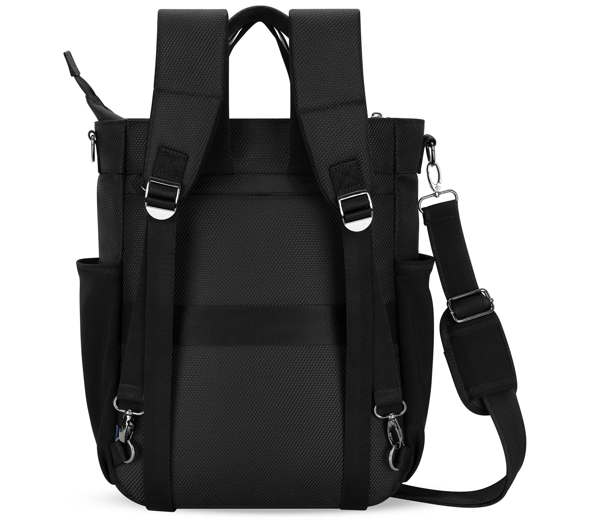 • Zip top closure; double handles; single adjustable, removable strap; locking zippers; chair loop lock; front secret slip pocket; dual exterior water bottle pockets; dual exterior roomy zippered pocket; back slip pocket; luggage pass-thru