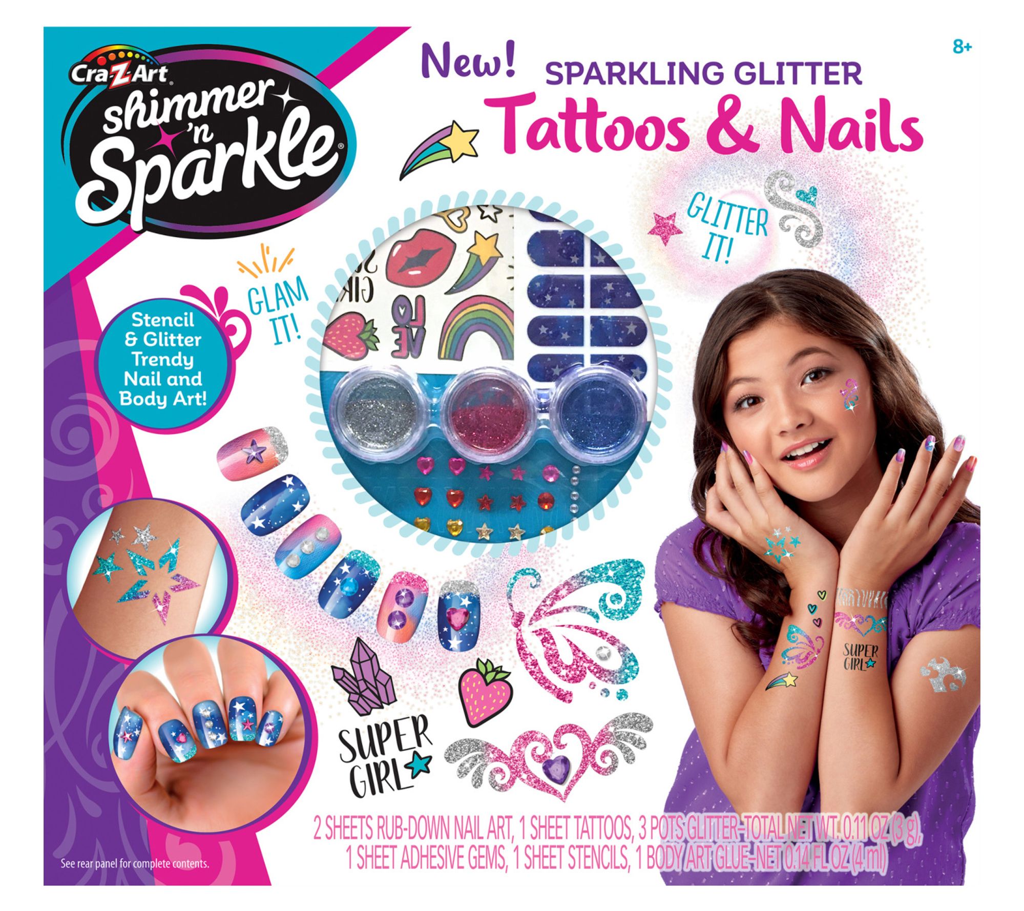 Kids can dazzle and shine with the Shimmer 'M Sparkle Sparkling Glitter Tattoos and Nails art kit. It contains assorted pieces of glittery nails and stickers that let them create the ultimate in gorgeous nails and body art. Great for parties and fun with friends! From Shimmer 'N Sparkle.