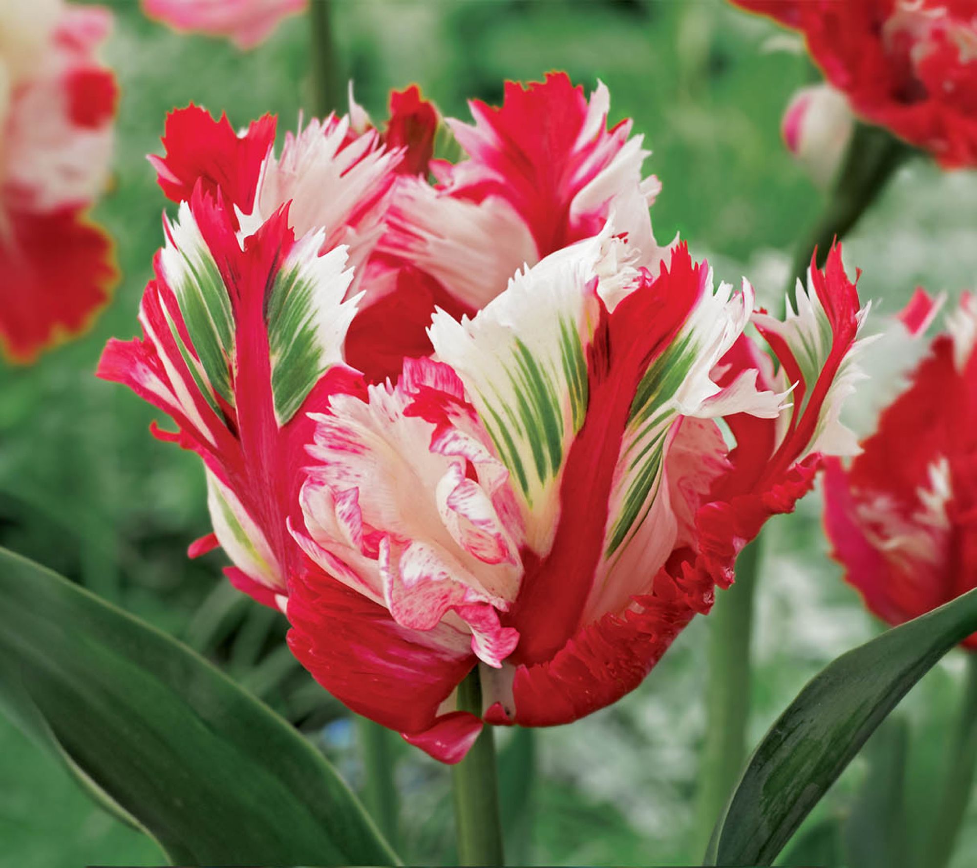 Bright pops of color dance through the garden when these showstopping Parrot Tulip bulbs bloom, transforming beds, borders, and patio containers into a lively spring spectacle. Their various shades of red, pink, and white create eye-catching patterns, providing a playful setting for outdoor dinners or peaceful morning strolls. From de Jager.