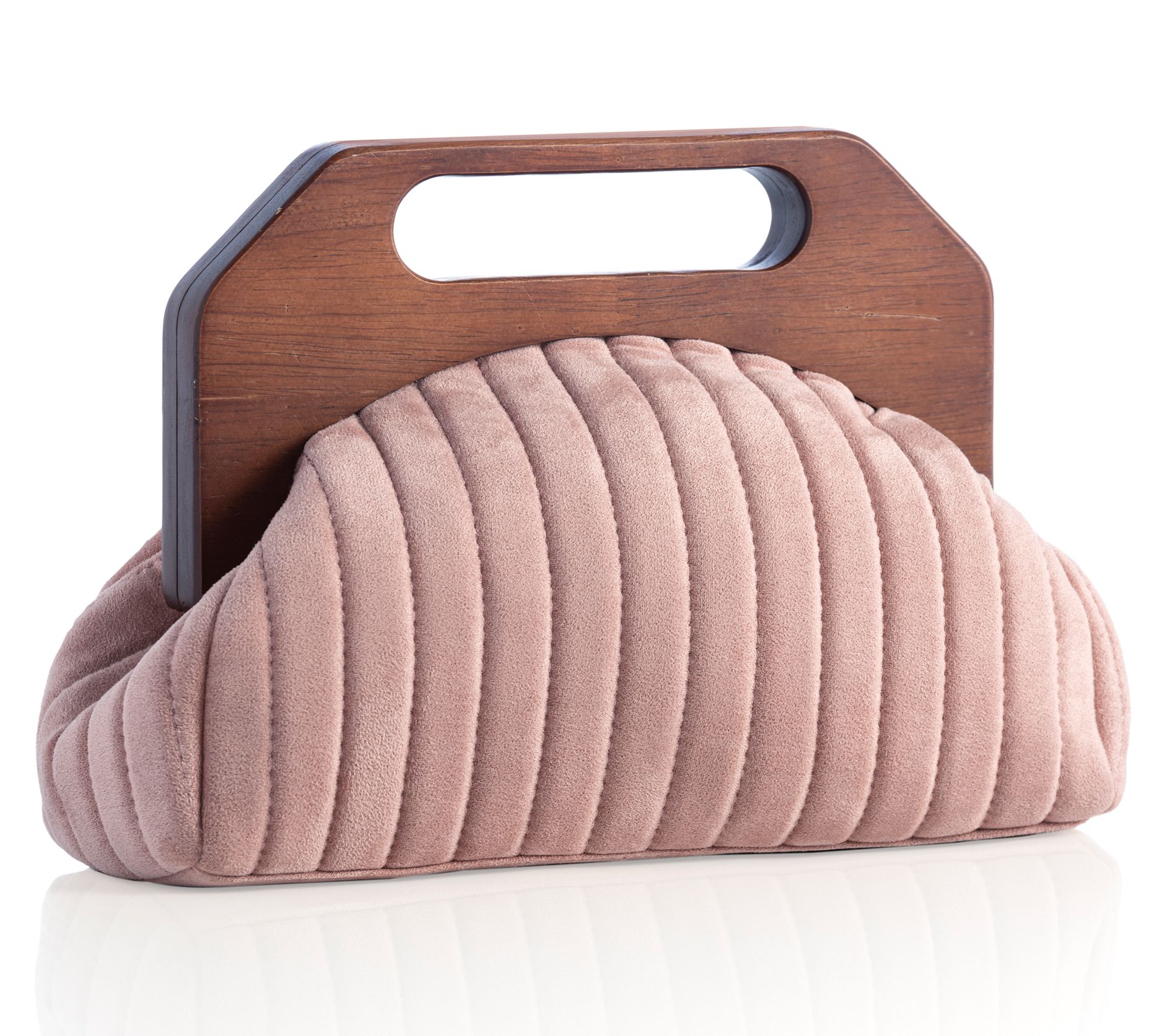 Showcasing a blush-colored, rib-quilted exterior and an intriguing wooden handle, the Evan clutch is a beautiful way to add chic style to your look. From Shiraleah.
