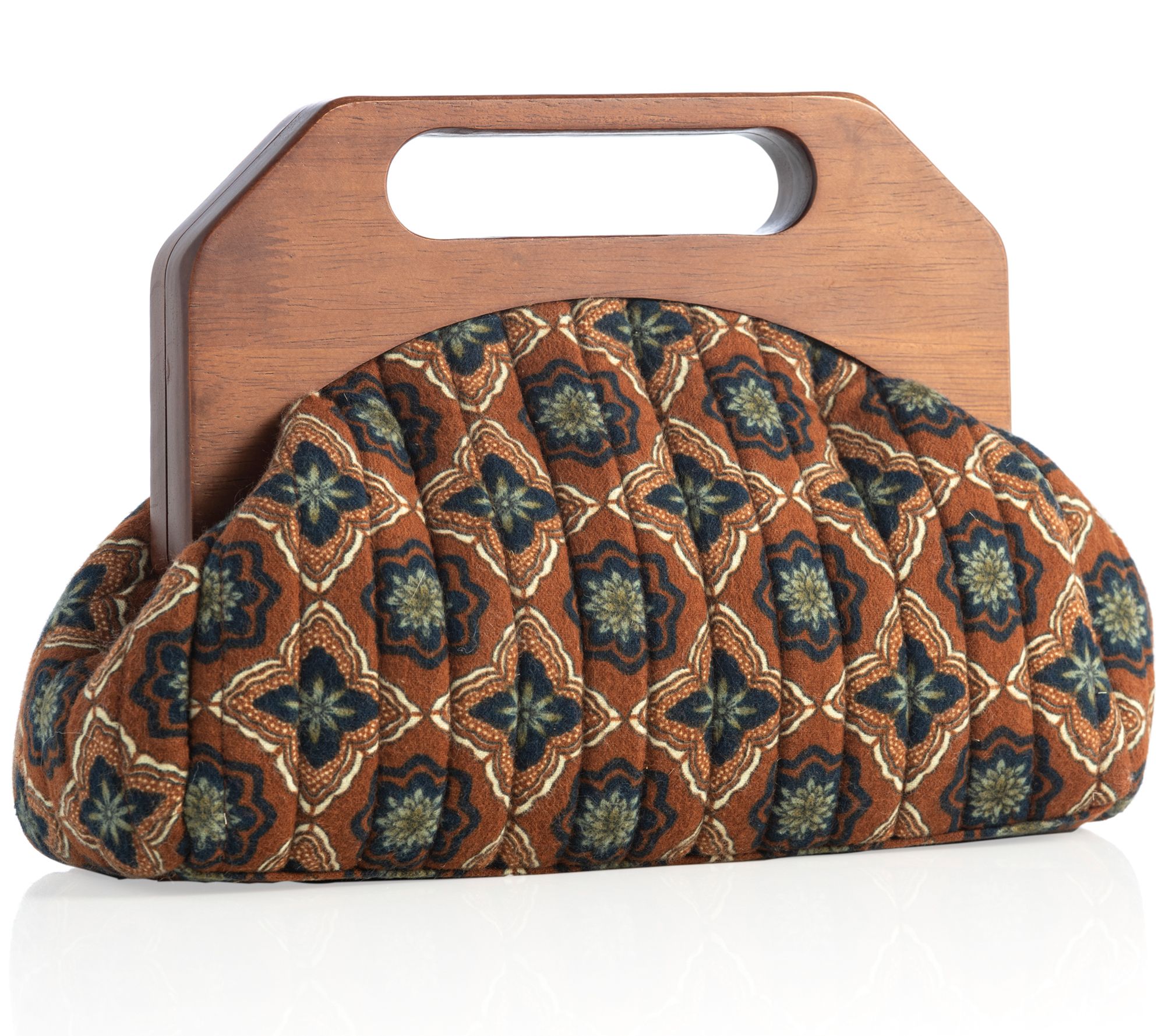 Showcasing a beautifully patterned, quilted exterior and a rich wooden handle, this clutch is a great way to add chic style to your look. From Shiraleah.