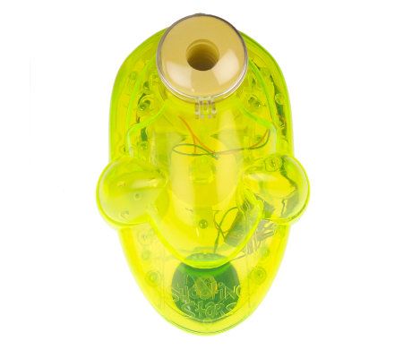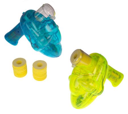 Kids have fun lighting up the night with the Shooting Stars Glow-in-the-Dark Foam Disk Shooter. The specially-coated foam discs glow as they come out of the shooter and streak across the sky or a dark room. A built-in Black Light Glow System ensures the disks are fully glowing when they leave the shooter. Discs fly approximately 35 feet. With an on/off power switch. For indoor or outdoor use. Includes 20 disks. Requires 3 AA batteries, not included.