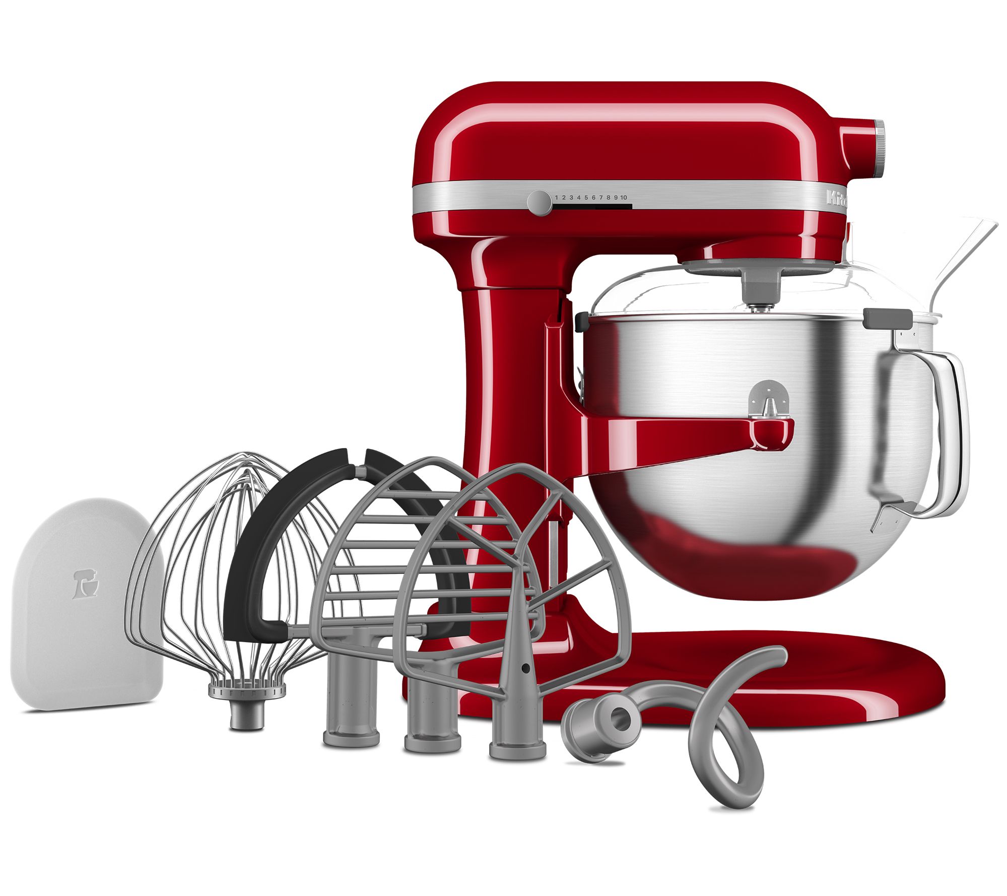 Includes KSM70SKQX Bowl-Lift stand mixer, 7-qt stainless steel bowl with handle, bowl scraper, pouring shield, dough hook, flat beater, wire whisk, double Flex Edge beater, and pastry beater