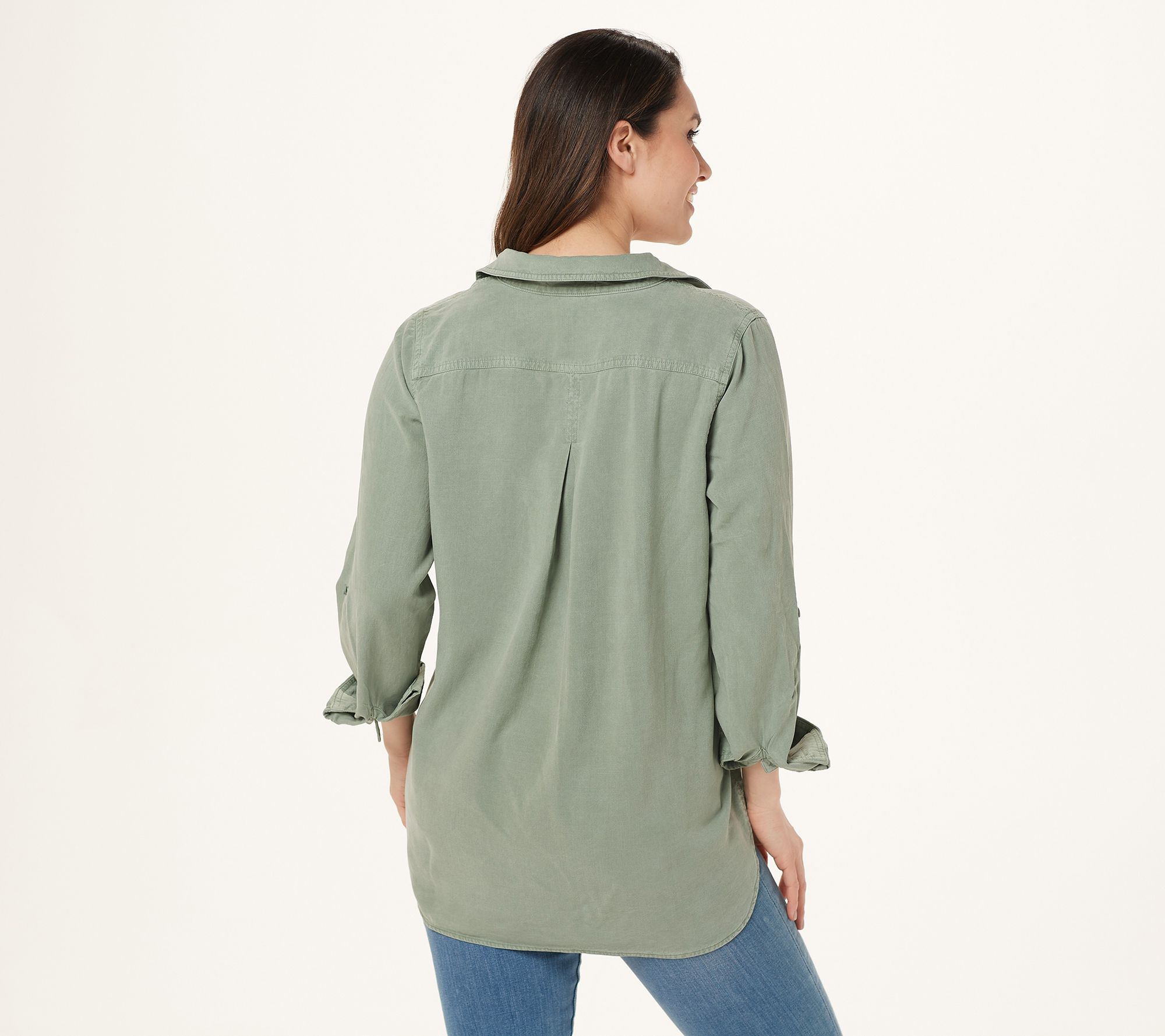 • Features: button-front closure, sleeve roll tab, rounded front patch pocket, shirttail hem, collar, and center back inverted pleat