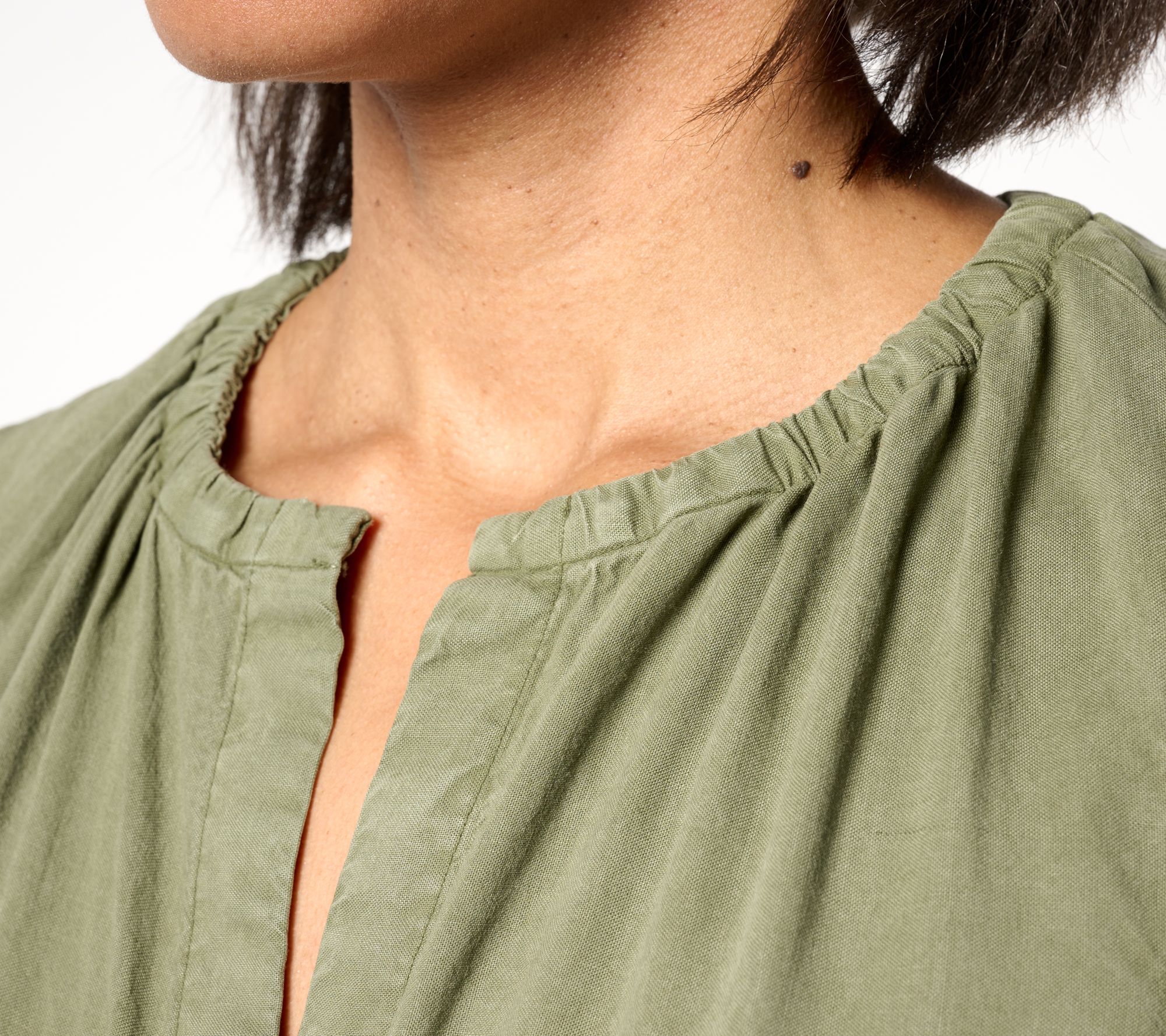 Features: sleeveless, gathered elastic neckline, button front closure, self-tie belt