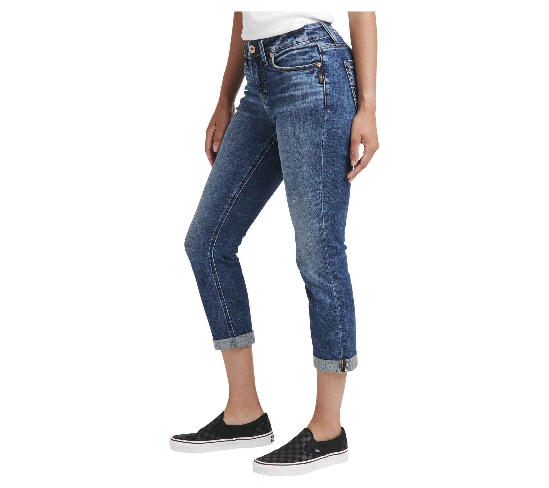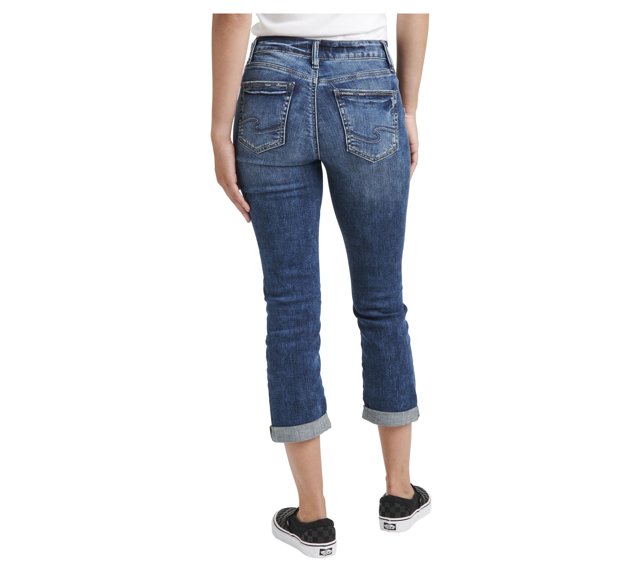 Behind every tough women is a tough pair of jeans. These oh-so flattering mid-rise stretch capris are designed to move when you do. From Silver Jeans Co.
