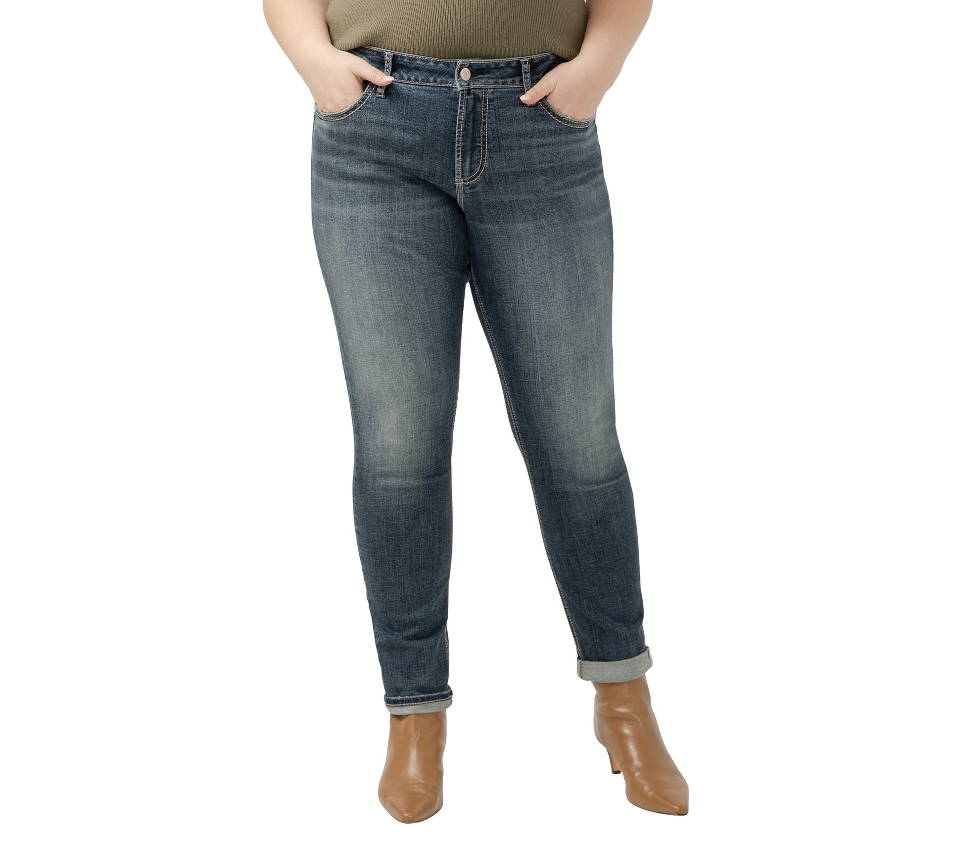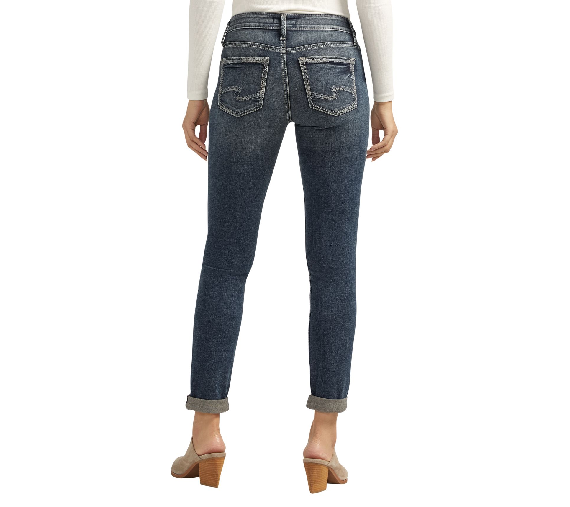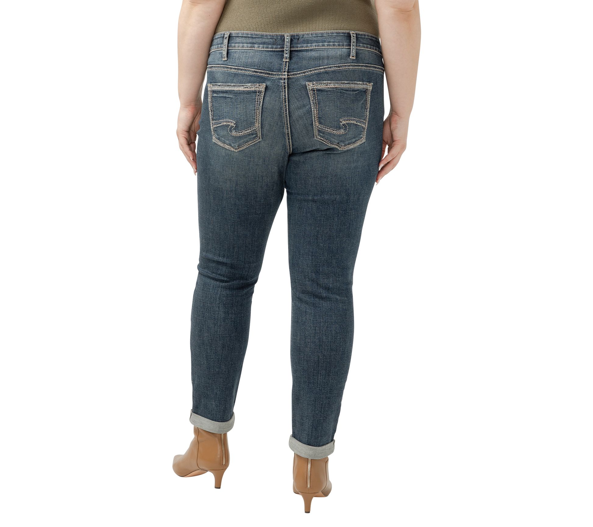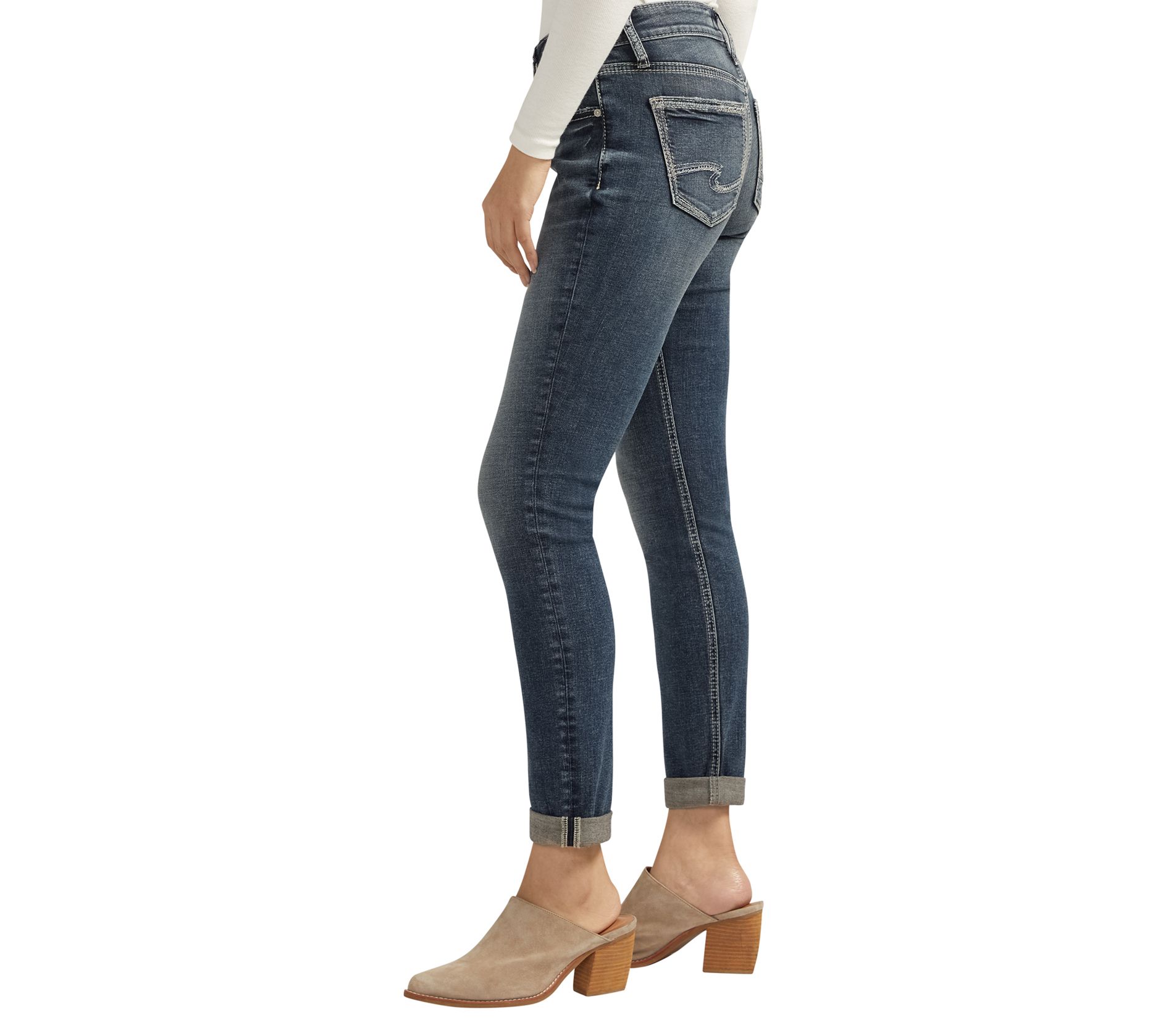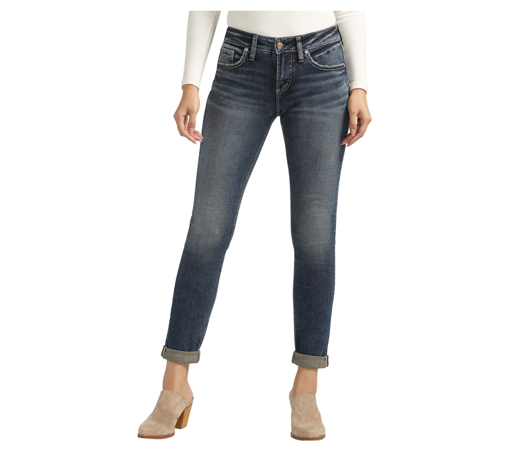 Like your best friend, the Silver Jeans Co. girlfriend mid-rise skinny jeans will become your go-to favorite. With a slimmer, more feminine silhouette than traditional boyfriend jeans, these jeans offer a relaxed fit through the hip and thigh. From Silver Jeans Co.