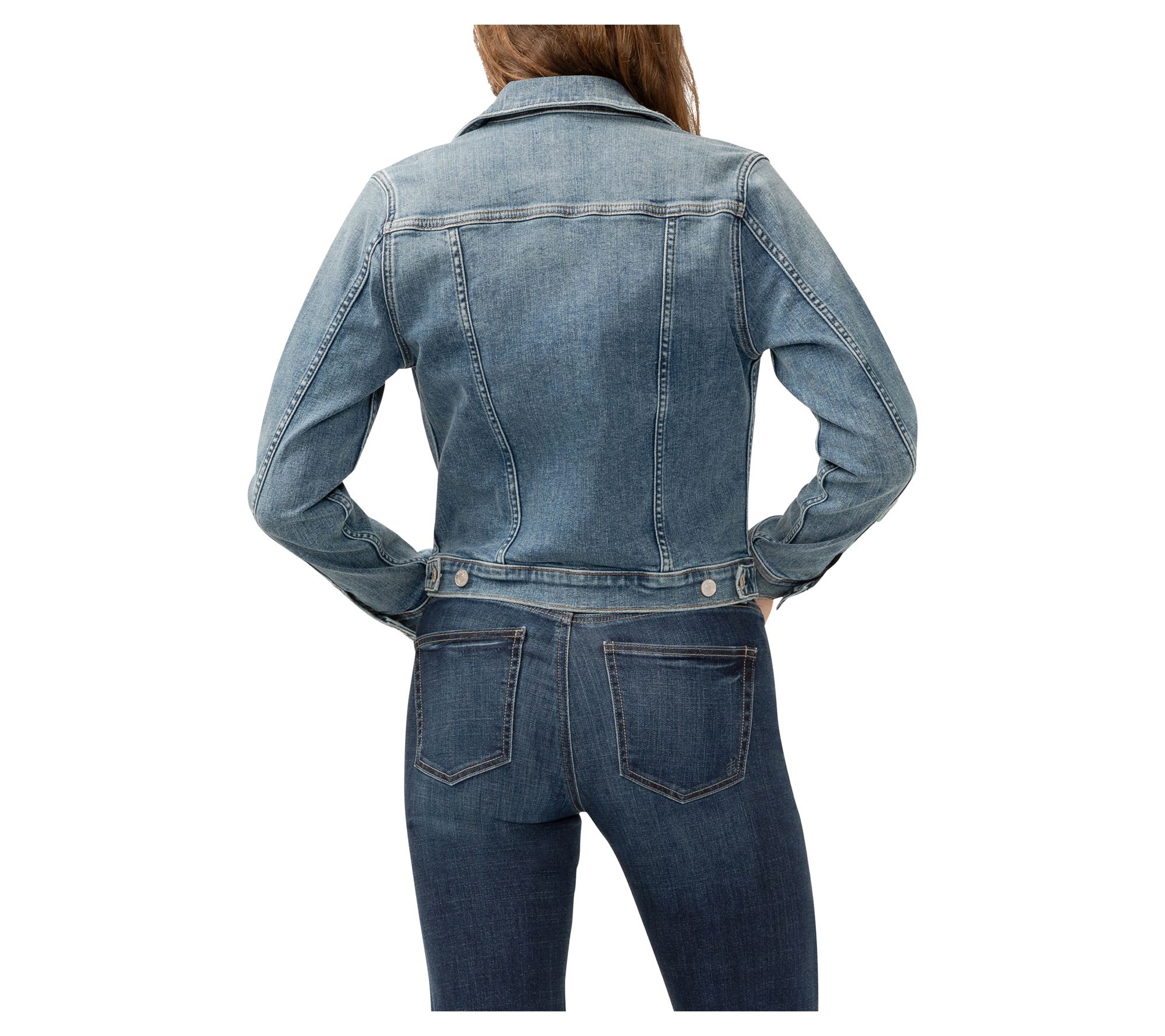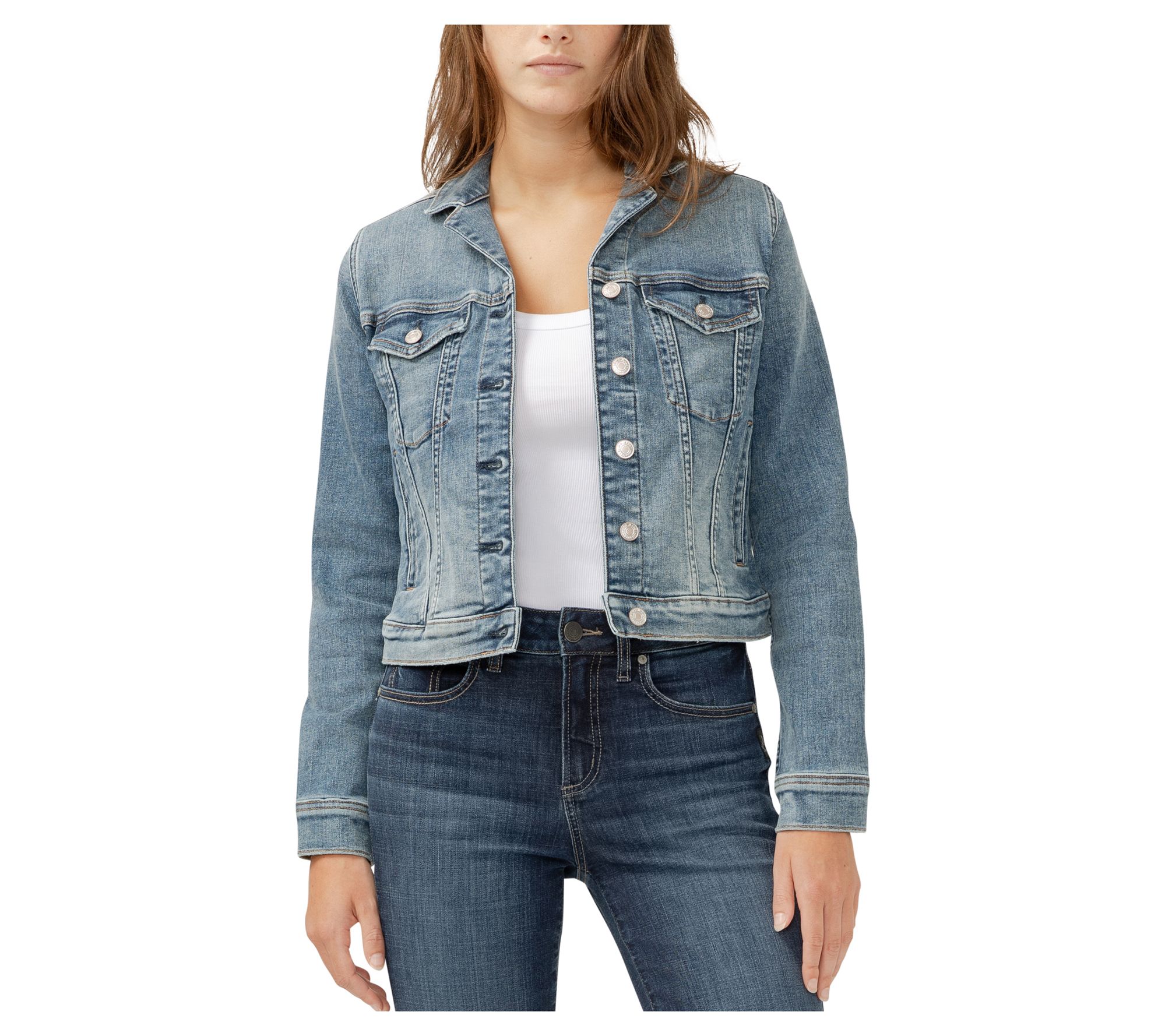 Perfect for a day out with friends or a casual office look, this crop jean jacket adds just the right amount of edge to your style. Its notched design complements any outfit, whether you're going for full denim or mixing it up with a floral skirt. Enjoy the versatility this jacket offers for making standout fashion statements in any setting. From Silver Jeans Co.