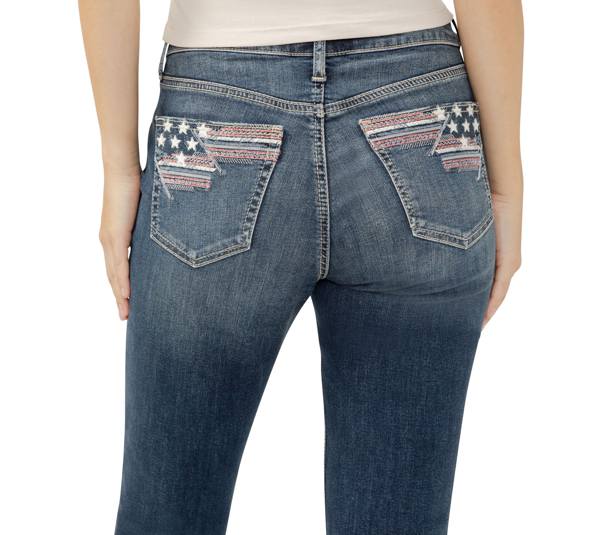 Features: five-pocket styling, contoured waistband for a zero-gap fit, Power Stretch denim for flexibility, capri length, Americana details on back pockets
