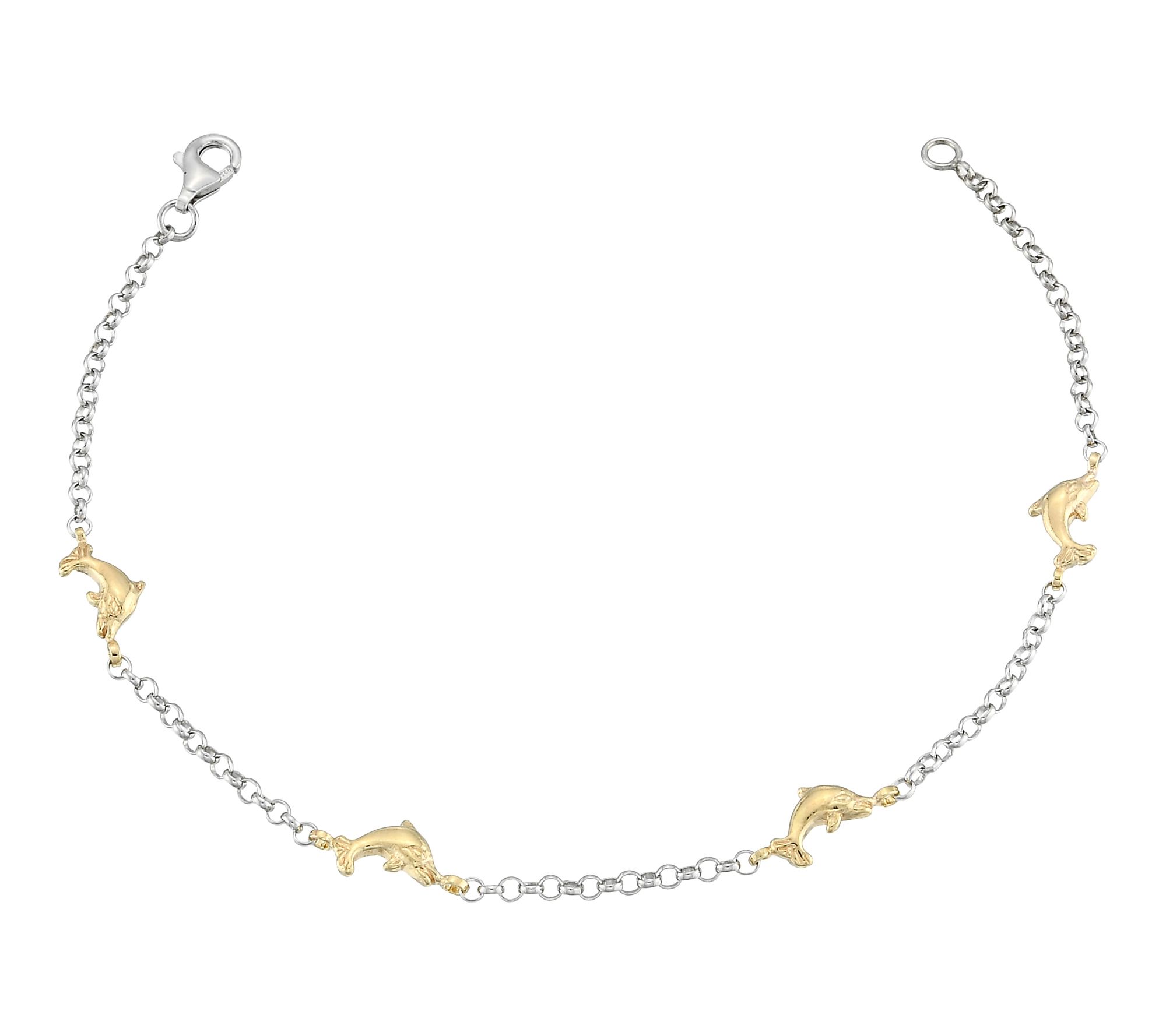 • Two-tone design; rolo link; polished and rhodium finish; 14K yellow gold-plated sterling silver dolphin stations