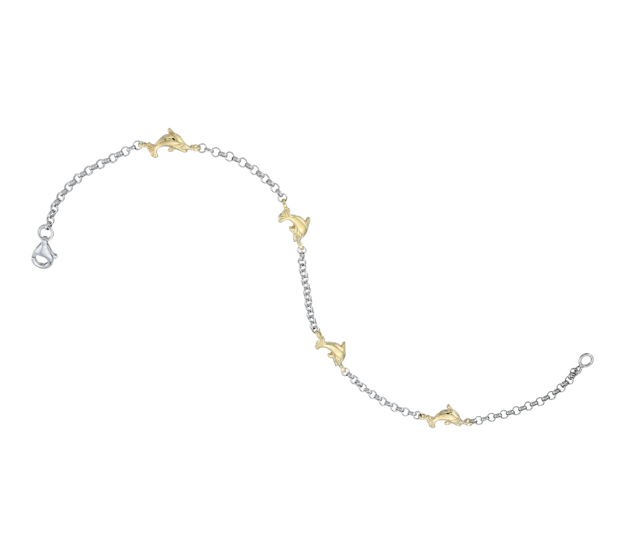 Let your style shine as you slip on this two-tone rolo chain dolphin bracelet. Golden-accented dolphins dance along a polished sterling silver chain, making every day feel like a celebration of harmony and playfulness -- an easy addition to your favorite looks, from weekend wear to evening outings. From Silver Style®.