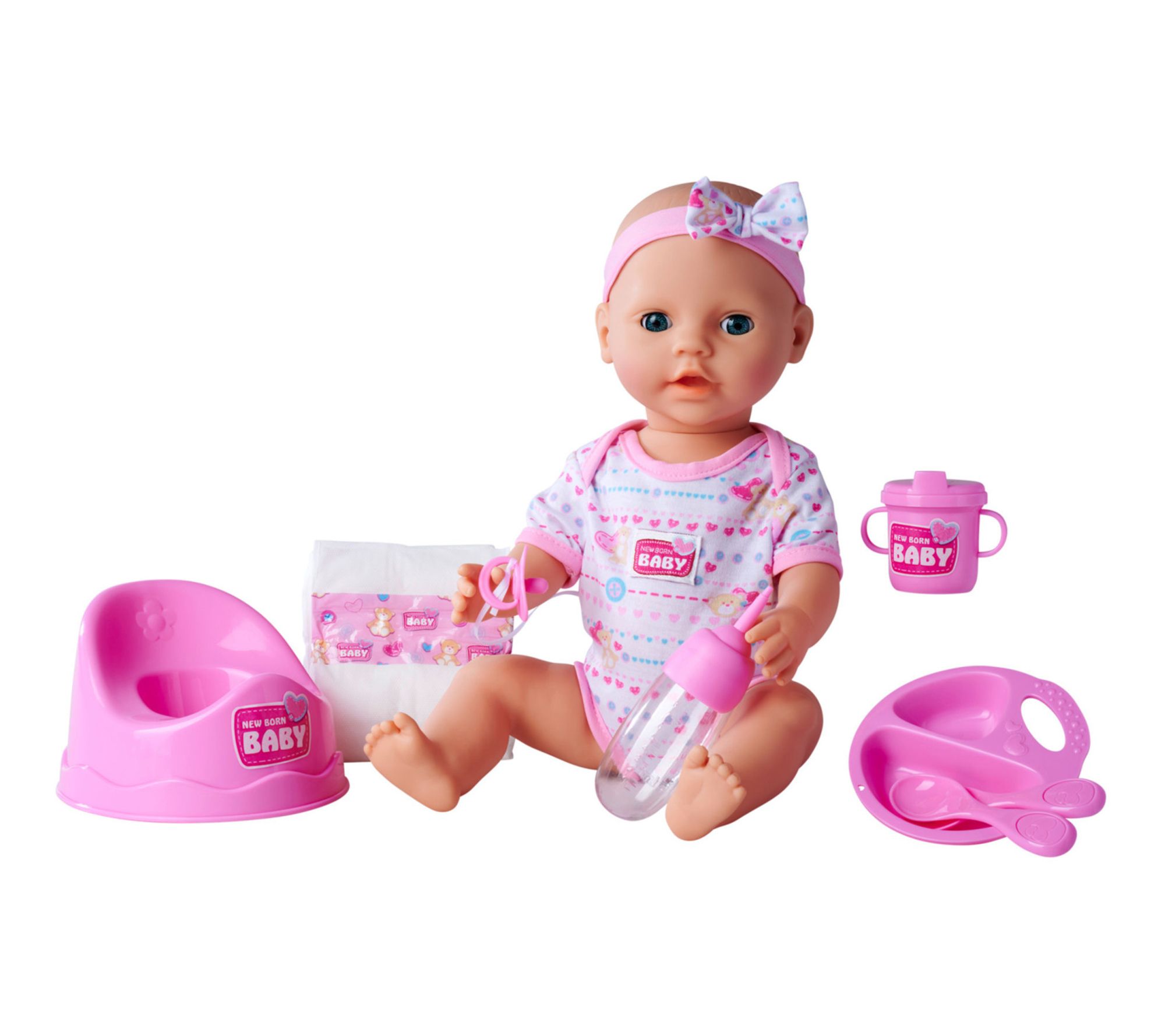 • Includes baby doll, bottle, sippy cup, pacifier, potty, diaper, and three eating accessories