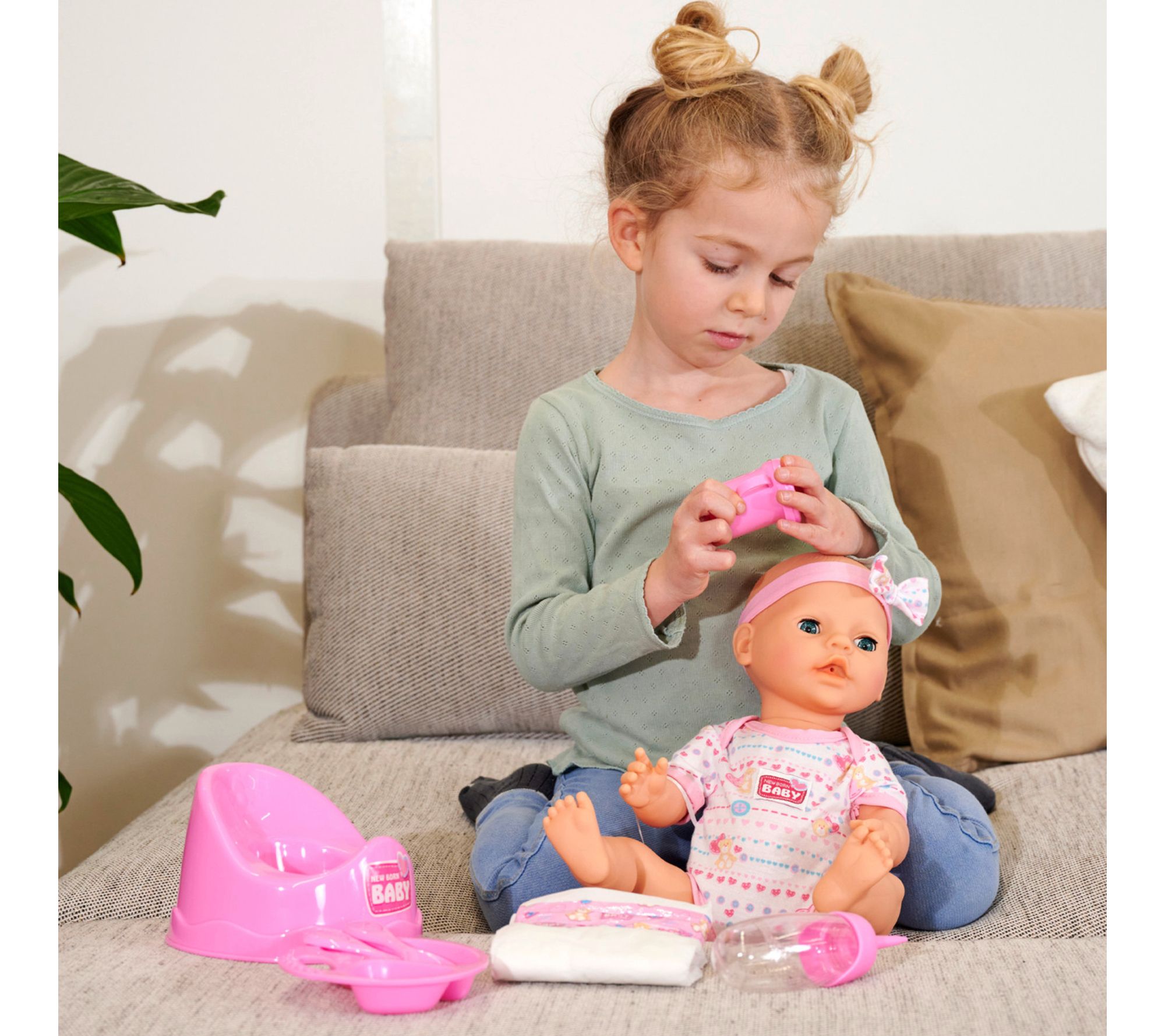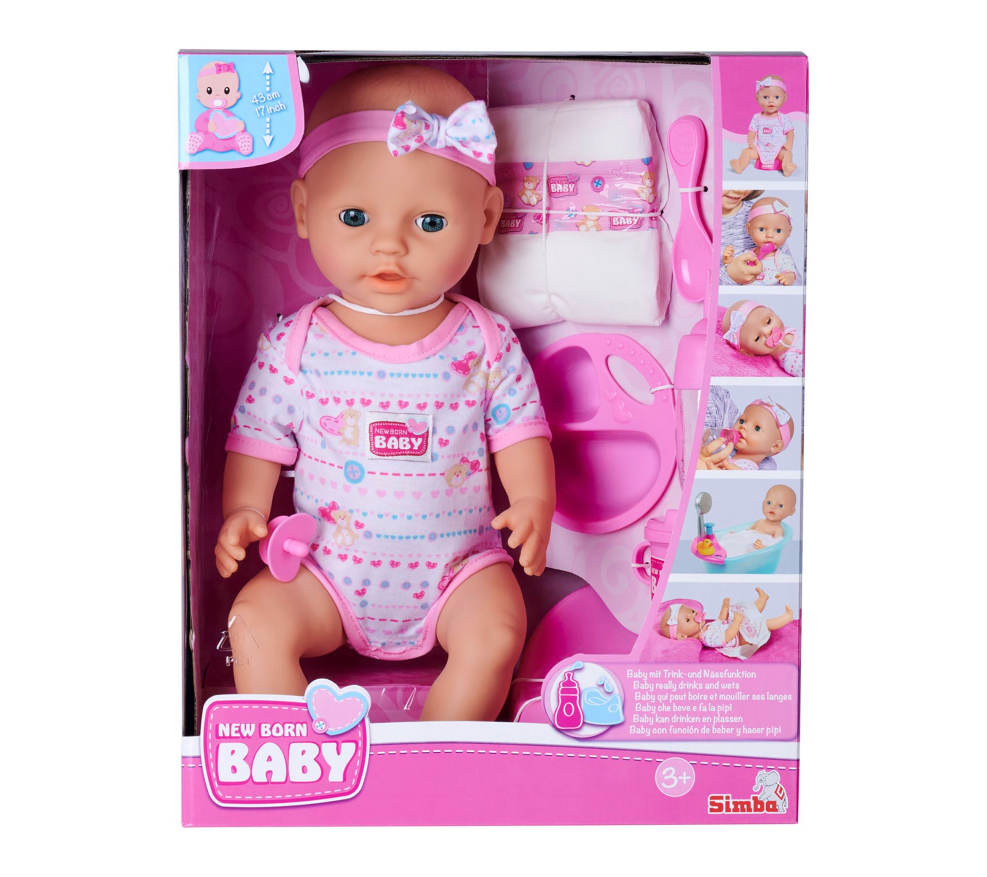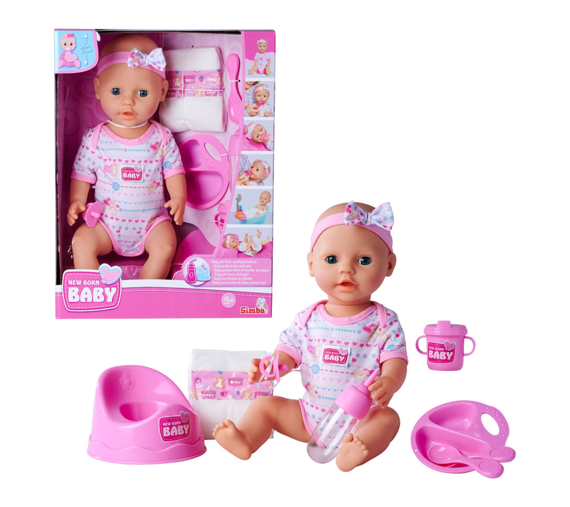 Bring a world of nurturing play to your home with this adorable newborn baby doll and its charming pink accessories. Young caregivers can feed the doll water, care with essentials like a diaper and pacifier, and watch as the doll uses the included potty just like a real baby. Little ones will love imagining endless scenarios with this interactive 17" doll and its engaging accessories. From Simba Toys.
