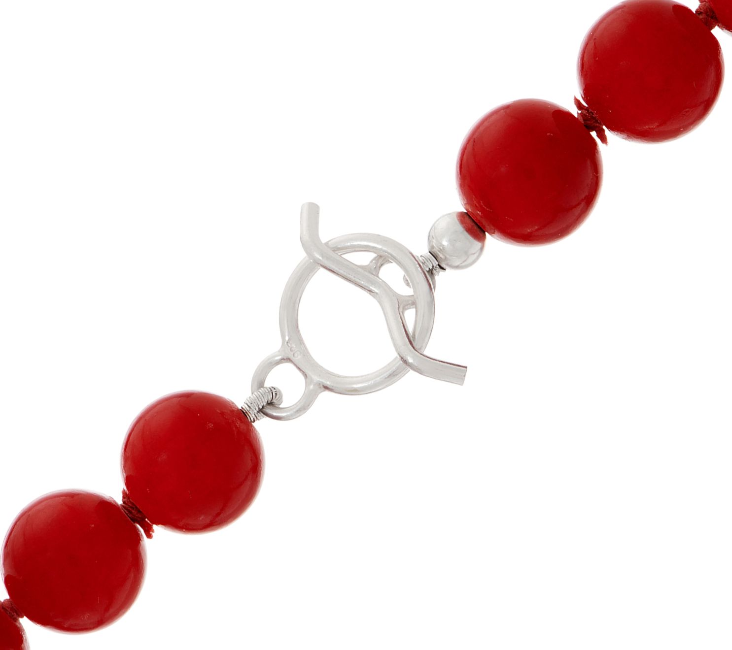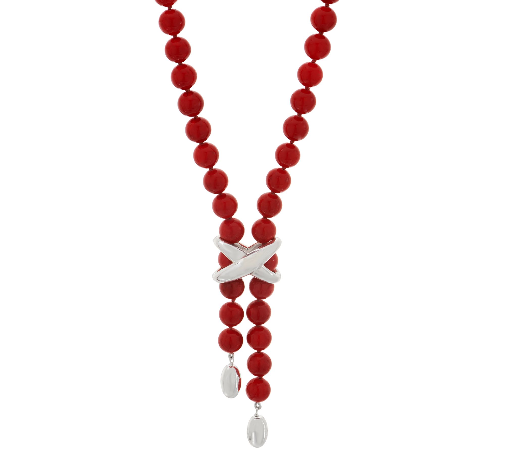 • Lariat-style necklace, red dolomite gemstone beads, sterling silver electroformed crisscross design on front with oval hanging beads at uneven lengths, wax-filled