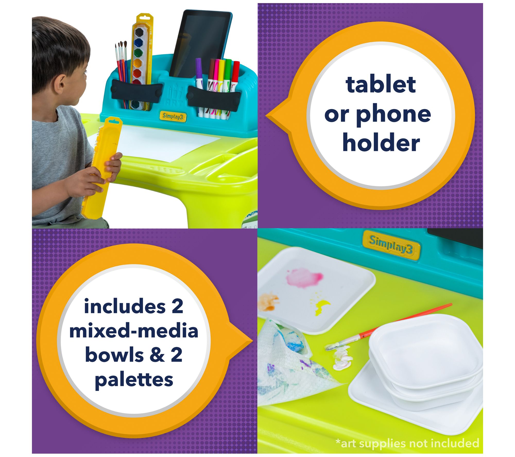 • Includes desk, two paint palettes, two mixed media bowls, and marker organizer