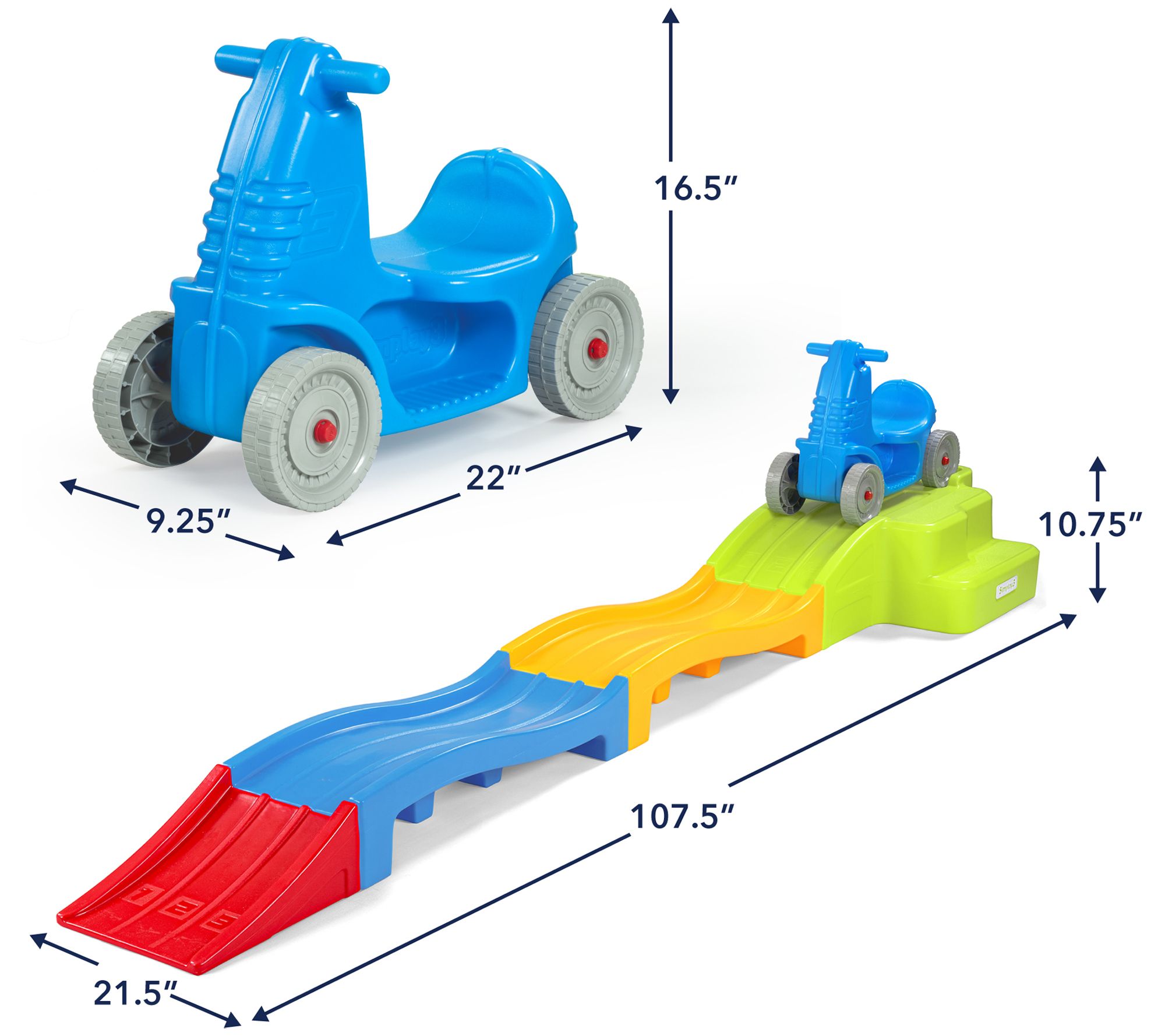 • Measures 9.25" x 22" x 16.5" (car); 21.5" x 107.5" x 10.75" (track)