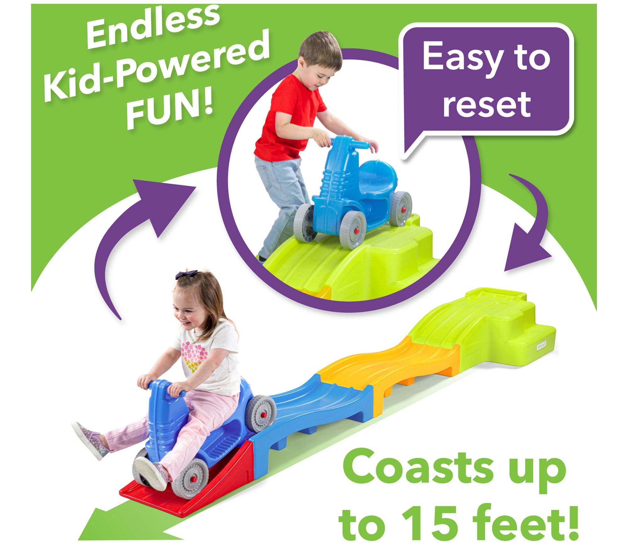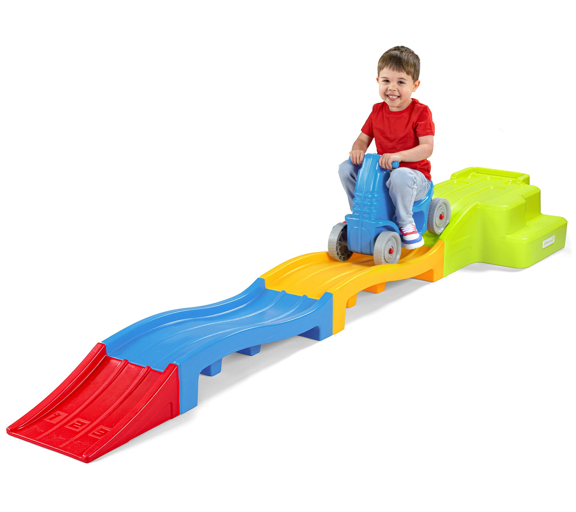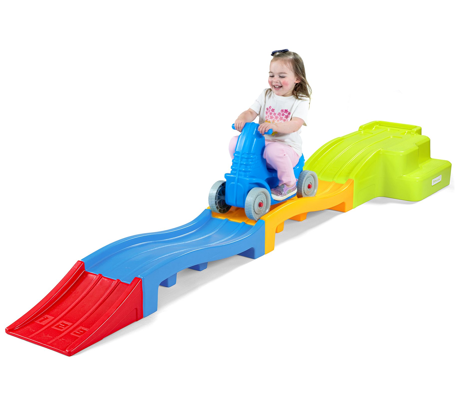 Set your little one's imagination and independence free with the Simplay3 Deluxe Expandable Kids Roller Coaster. This vibrant ride-on toy promises endless thrills, whether indoors or outdoors, thanks to realistic clicking wheels and easy-grip handles. Watch as they master pushing the coaster car up the ramp and enjoy the rush of coasting down. From Simplay3.