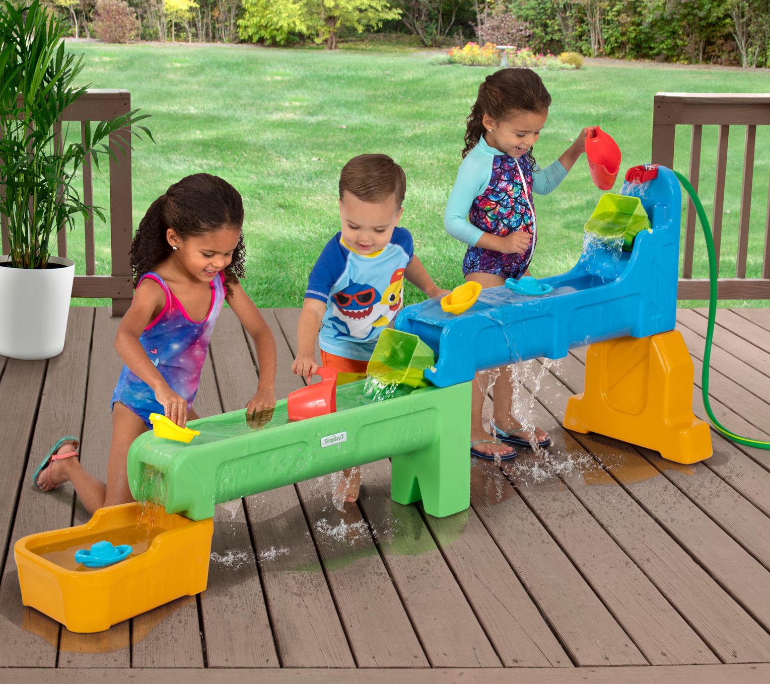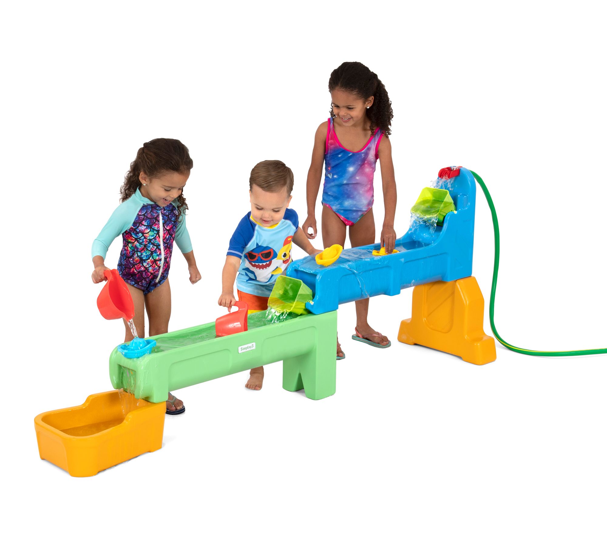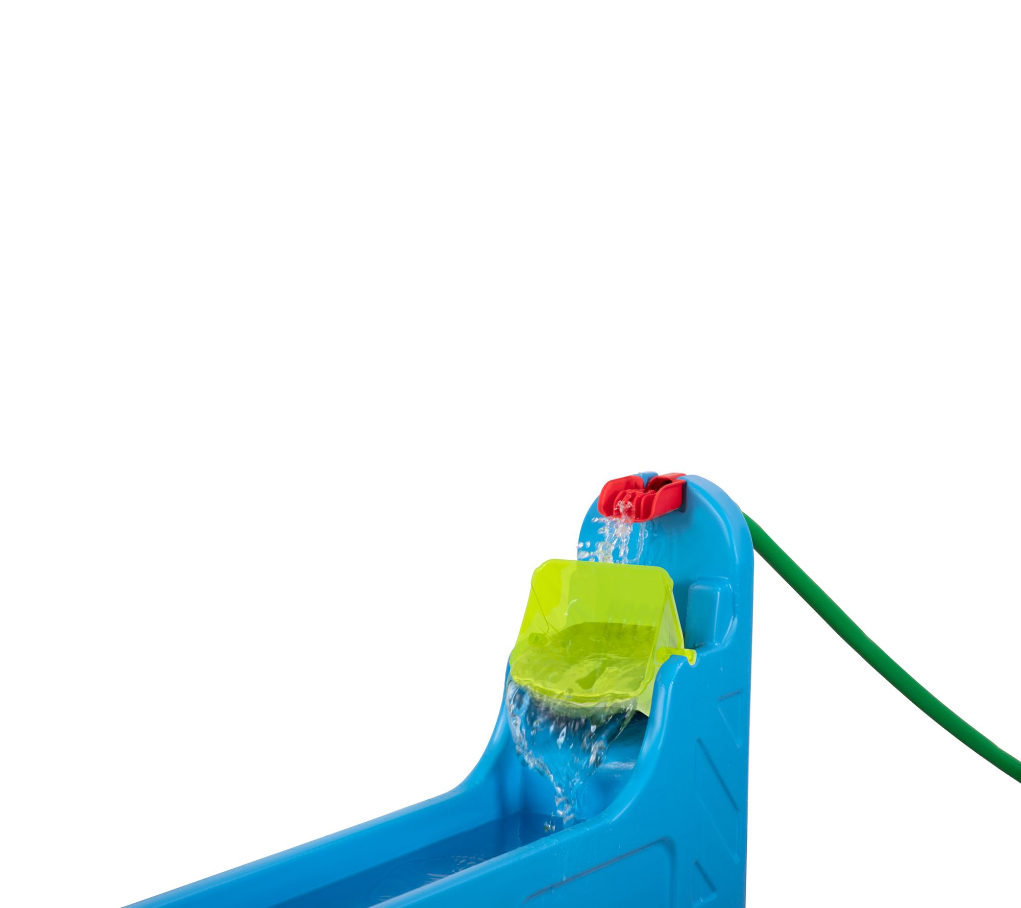 • Includes water table, two tipping buckets, four toy boats, two water-pouring cups, and one hose attachment