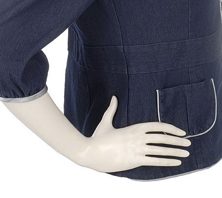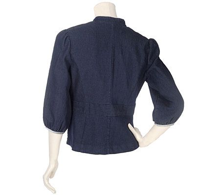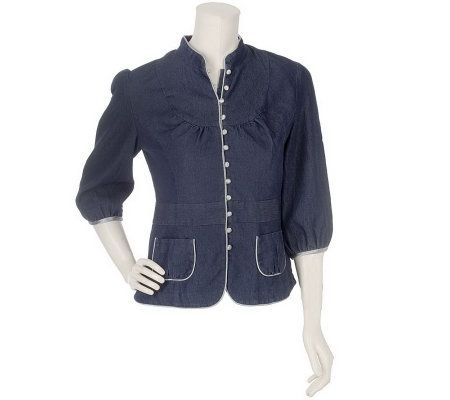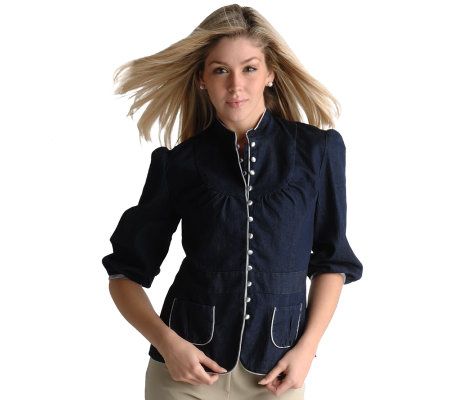 Although refined with a few grand gestures, this denim jacket is still your tried and true style standard. A mandarin collar and blouson sleeves update it with flair. From Simply. Chloe Dao.