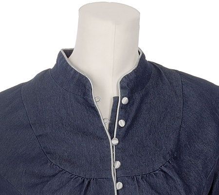 3/4 length blouson sleeves; loop and button-front closures; gathered front yoke; two front rounded patch pockets; piping on cuffs, pockets, and front