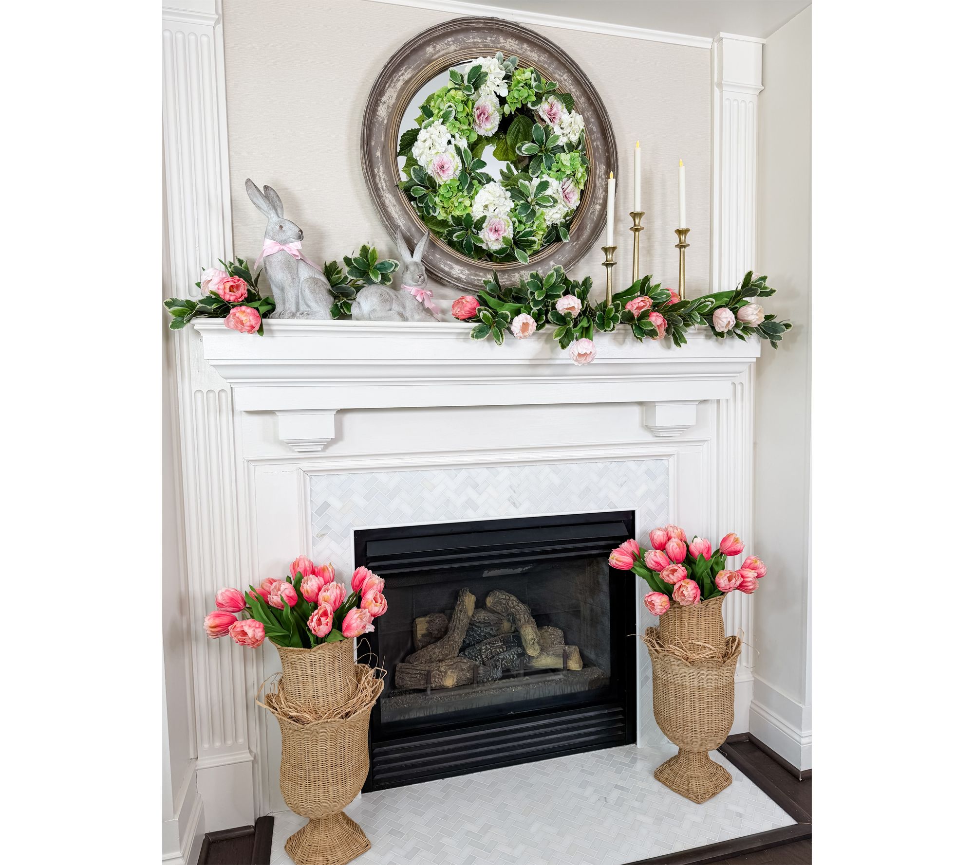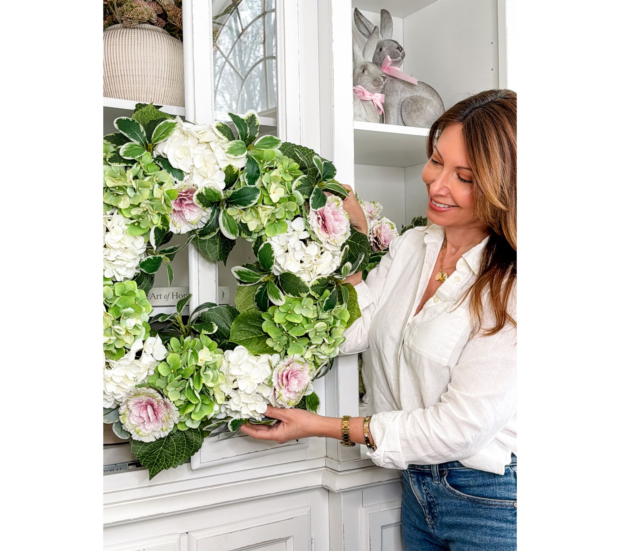Welcome guests with the inviting charm of this Real Touch hydrangea wreath, brimming with lush green accents like mini cabbages and variegated pittosporum for a look that feels as full as a blooming garden. Designed on a grapevine base and completed with a handy metal hanger, it's a beautiful way to dress up your front door or indoor space any time of year. From Simply Stunning by Janine Graff.